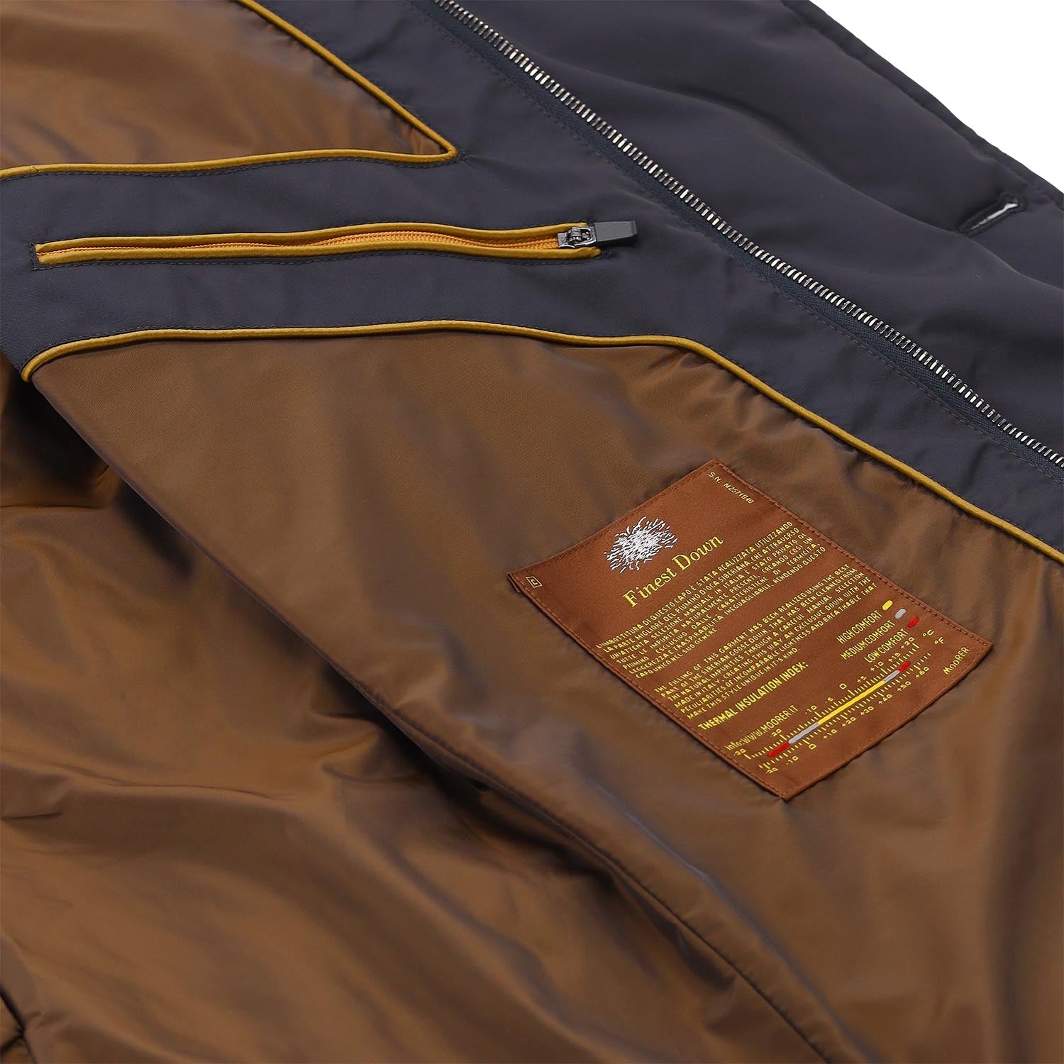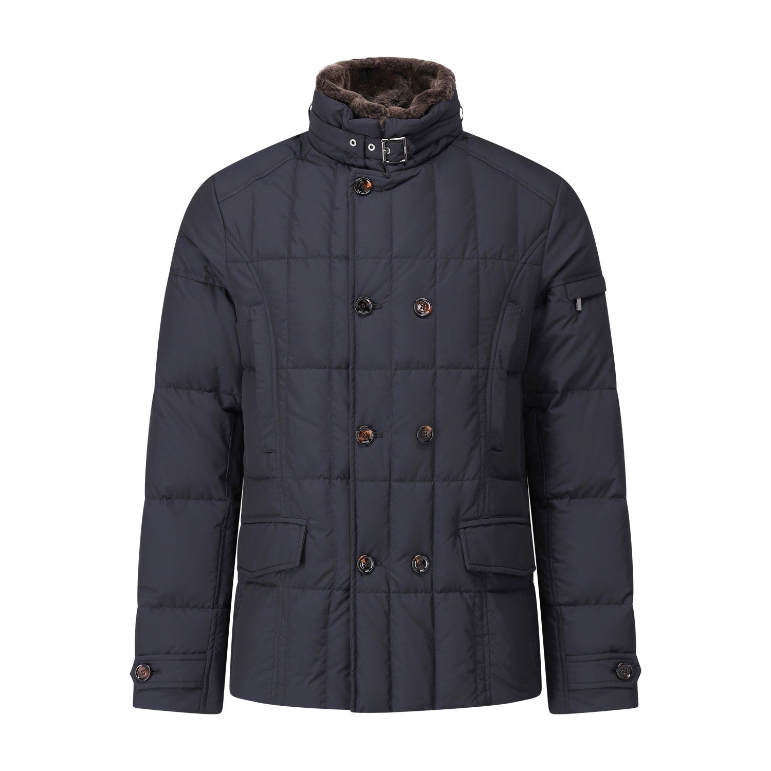 Diese luxuriöse Daunenjacke kombiniert erstklassige Materialien und Funktionalität. Die Wattierung aus Gänsedaunen und der changierende, wasserabweisende Gabardine-Taft mit Memory-Effekt sorgen für Stil und Schutz. Ein abnehmbarer Kragen aus australischem Schaffell und der doppelte Frontverschluss mit Reißverschluss und Hornknöpfen verleihen der Jacke einen exklusiven Touch.