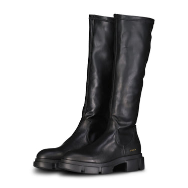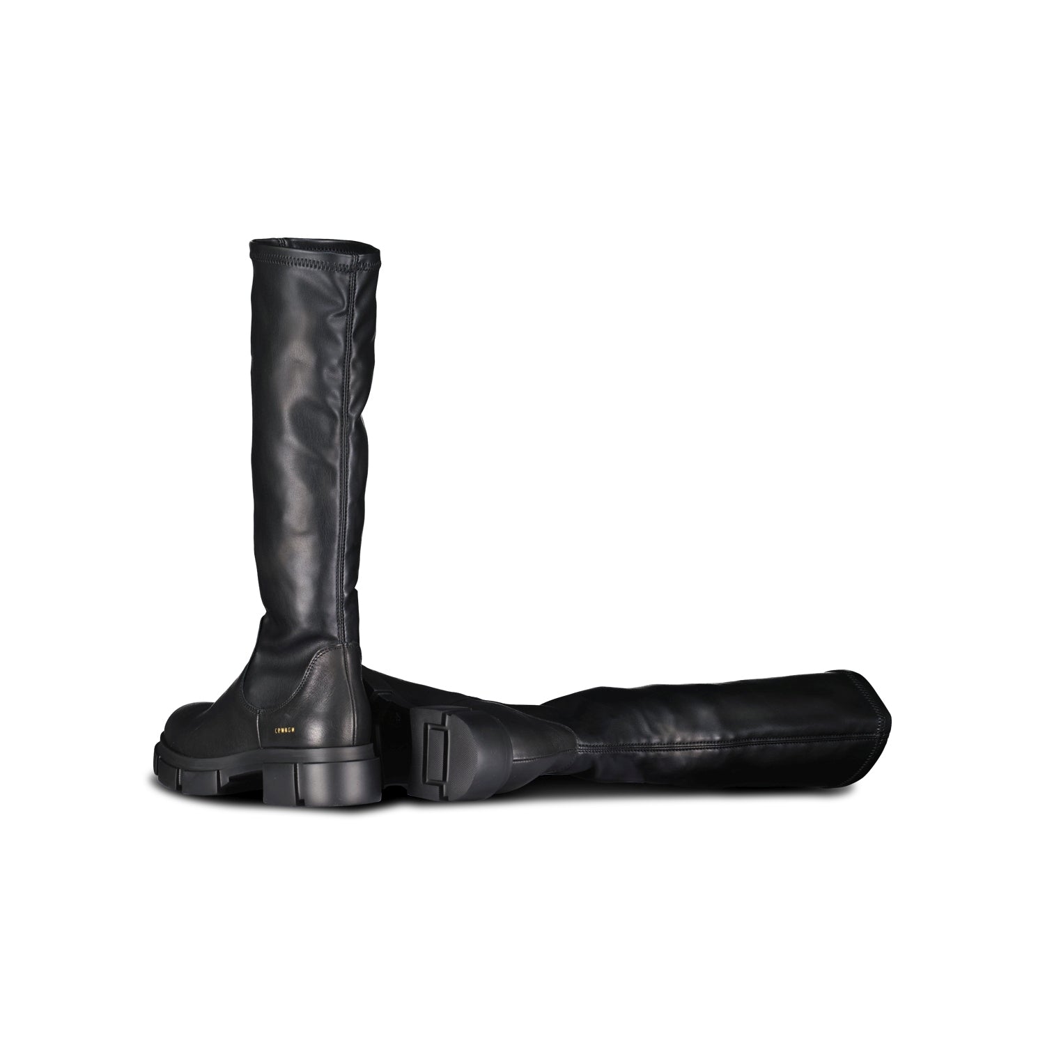 Diese kniehohen Stiefel kombinieren weiches italienisches Glattleder mit einem elastischen Schaft aus veganem Stretch und formen so eine elegante, schlanke Silhouette. Ein goldfarbenes Logo und die markante Profilsohle mit Blockabsatz verleihen dem minimalistischen Design eine kraftvolle Note. In Kopenhagen entworfen und in Portugal handgefertigt, stehen sie für hochwertigen Stil, Komfort und europäische Handwerkskunst.