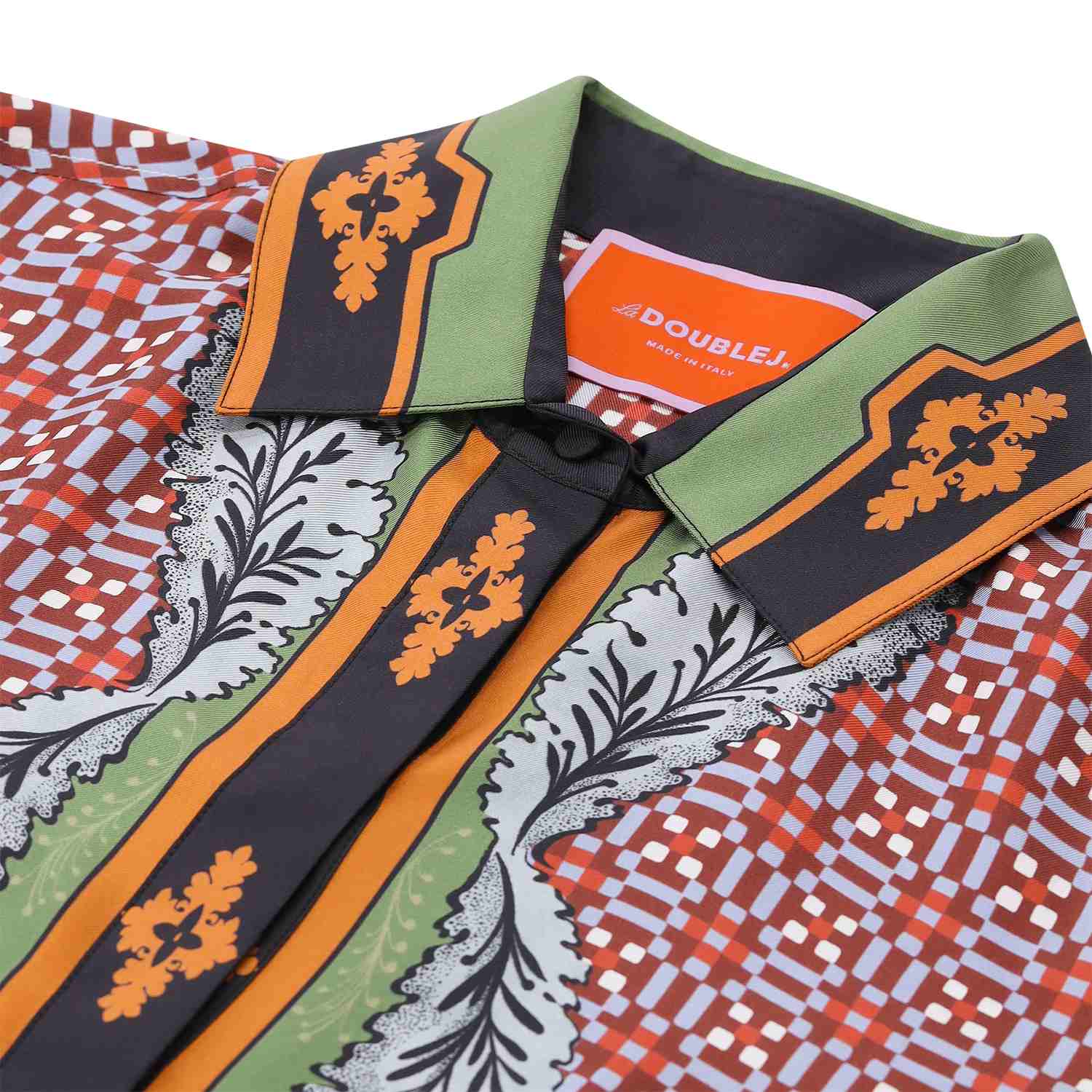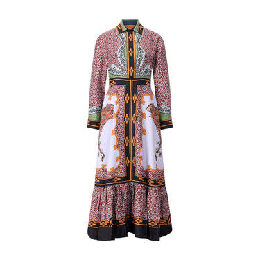 Dieses Maxikleid aus edler Seide begeistert mit einem farbenfrohen Print und verspielten Volants am Saum, die jedem Schritt eine elegante Leichtigkeit verleihen. Der Kragen mit Knopfleiste sorgt für raffinierte Details, während die Made in Italy-Qualität für luxuriöse Verarbeitung und zeitlose Eleganz steht.