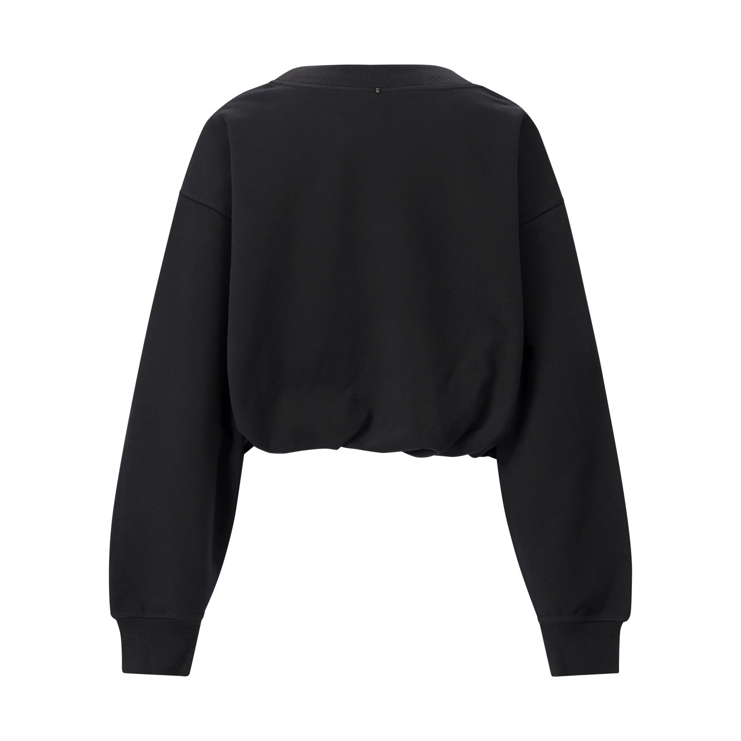 Dieser moderne Sweater überzeugt mit seinem weiten V-Ausschnitt und der lässigen Oversize-Passform in verkürzter Taillenlänge. Gefertigt aus einem weichen Baumwollstretchgemisch bietet er höchsten Tragekomfort, während der gepolsterte Bund und das Stretch-Tüll-Futter für eine besondere, strukturierte Silhouette sorgen. Gerippte Details an Kragen und Bündchen sowie ein dezenter Logoprint an der Schulter verleihen dem Design einen edlen, sportlich-eleganten Touch.