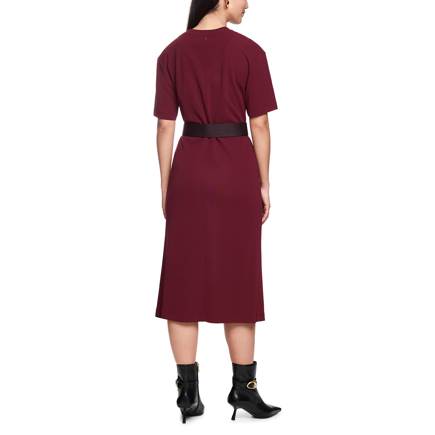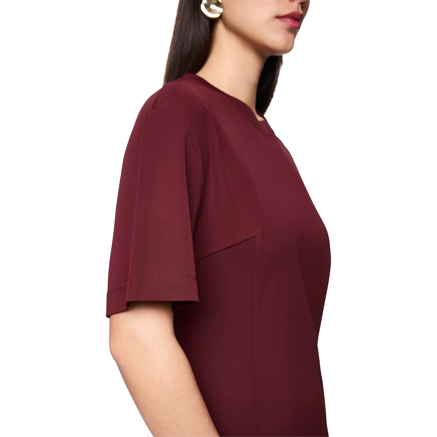Das Midi-Kleid überzeugt mit Rundhalsausschnitt, kurzen Ärmeln und einem dezenten Schlitz an der linken Vorderseite. Die leichte Taillierung betont sanft die Silhouette, während der lockere Schnitt für einen fließenden Fall und hohen Tragekomfort sorgt. Ein vielseitiger Klassiker, der im Alltag genauso wie zu besonderen Anlässen perfekt zur Geltung kommt.