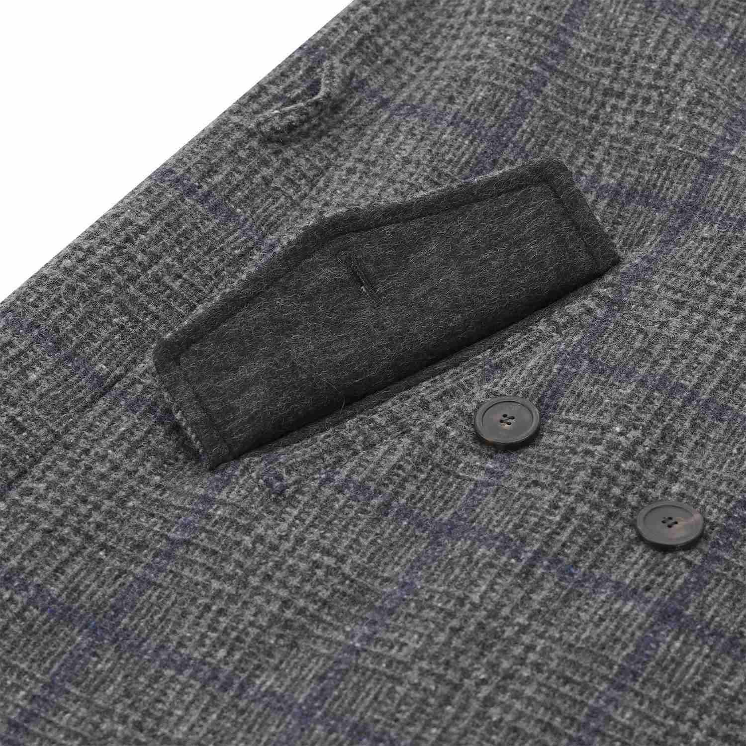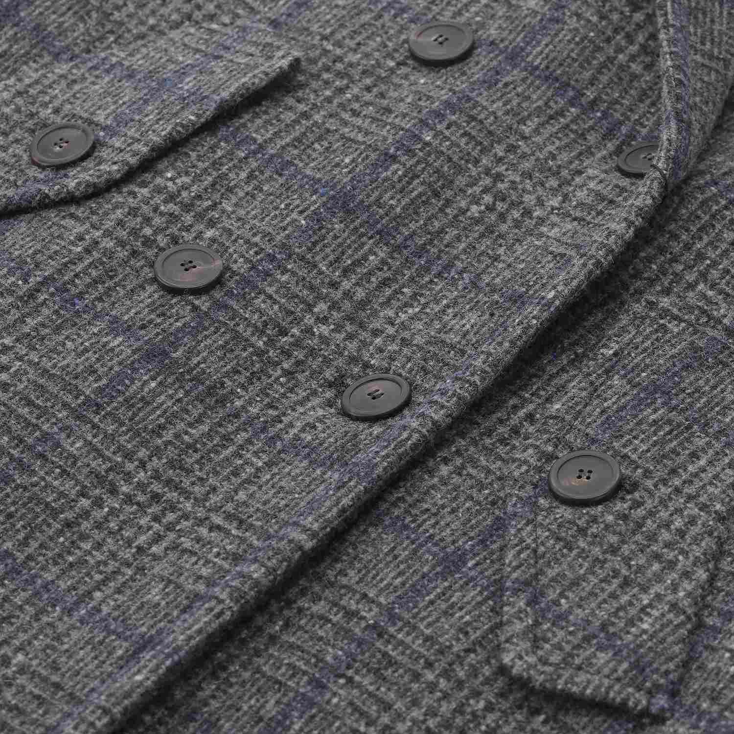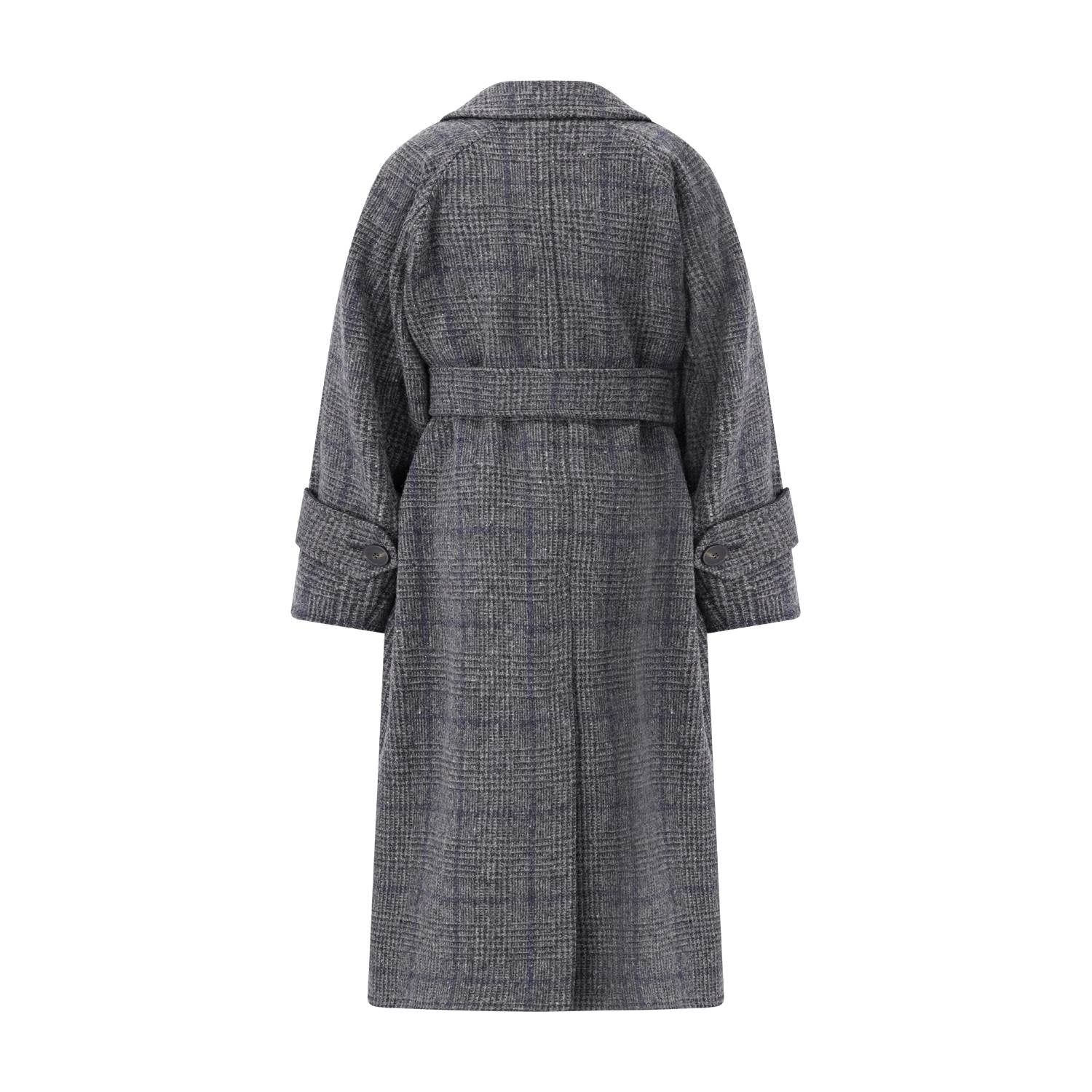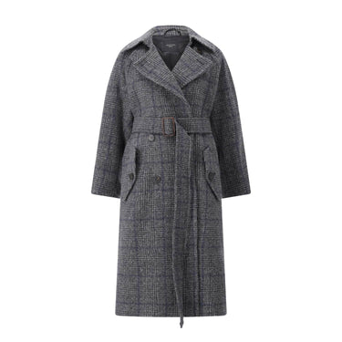 Dieser lange, doppelreihige Mantel aus edlem Wollmischgewebe präsentiert sich in klassischem Prince-of-Wales-Karo und vereint die Eleganz eines Tweedmantels mit dem markanten Volumen eines Trenchcoats. Die körpernahe Passform und der mittige Gehschlitz unterstreichen die feminine Silhouette, während der doppelt verwendbare Kragen mit Kinnriemen und die Raglanärmel mit Knebelverschlüssen raffinierte Akzente setzen. Knöpfe, Taillengürtel und seitliche Pattentaschen runden das Design stilvoll ab.