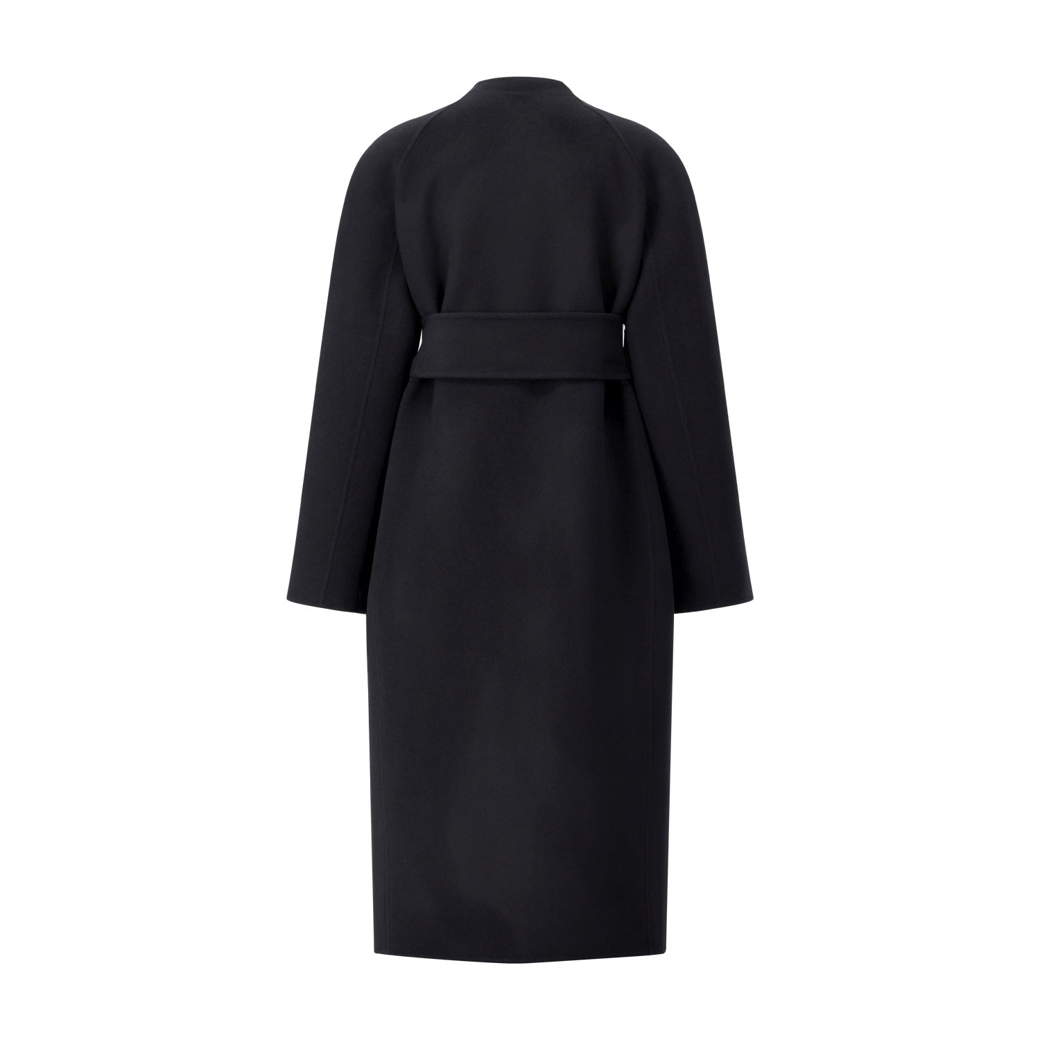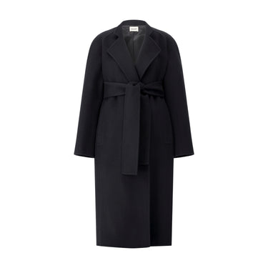 Der Mantel vereint moderne Raffinesse mit müheloser Eleganz. Aus doppelseitiger, melierter Wolle gefertigt, bietet er einen lockeren Sitz, der durch einen Taillengürtel schmeichelhaft betont wird. Raglanärmel, innenliegende Schulterpolster und praktische Seitentaschen verleihen dem minimalistischen Design Struktur und Funktionalität.