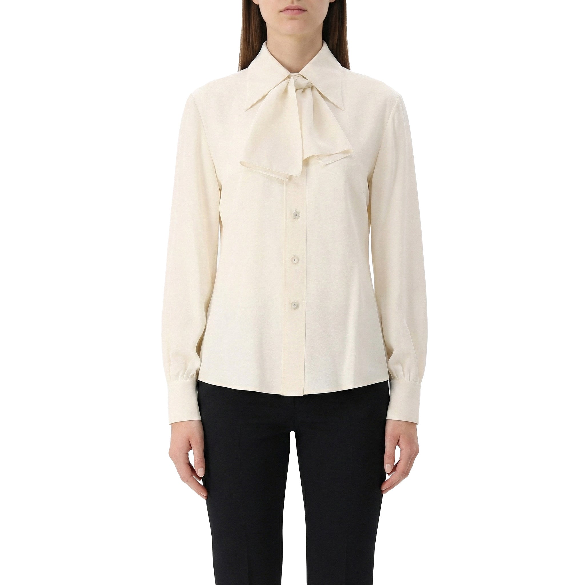 Diese elegante Bluse aus feiner Crêpe de Chine-Seide vereint luxuriösen Komfort mit femininer Raffinesse. Der V-Ausschnitt und das integrierte Halstuch-Detail setzen stilvolle Akzente, während der Knopfverschluss vorne klassische Eleganz ausstrahlt. Hergestellt in Italien.