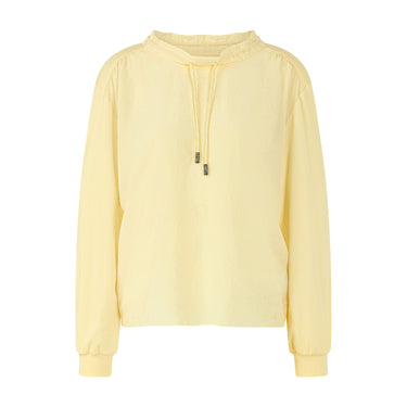 Dieses lässige Shirt vereint sportliche Lässigkeit mit eleganter Raffinesse. Der lockere Schnitt und der Rundhalsausschnitt mit Kordelzug verleihen ihm eine moderne, entspannte Silhouette. Die Vorderseite aus fließendem Stoff trifft auf Ärmel und Rückseite aus feinem Rippstrick – ein stilvoller Materialmix, der Komfort und Struktur harmonisch verbindet.