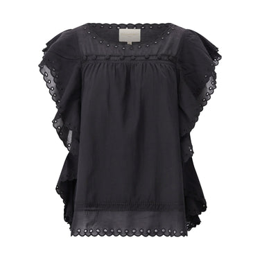 Das Blusenshirt besticht durch ihren luftigen, weit geschnittenen Stil und einen Rundhalsausschnitt. Sie ist ohne Ärmel und mit einem versammelten Vorder- und Rückenteil versehen. Dekorative, verdeckte Knöpfe an der Vorderseite setzen einen eleganten Akzent, während die Broderie anglaise Verzierungen einen zarten, femininen Touch verleihen. Das Modell ist zudem gefüttert und sorgt für angenehmen Tragekomfort.