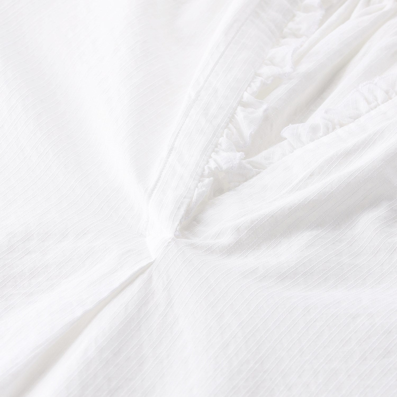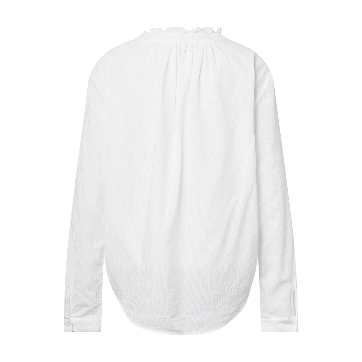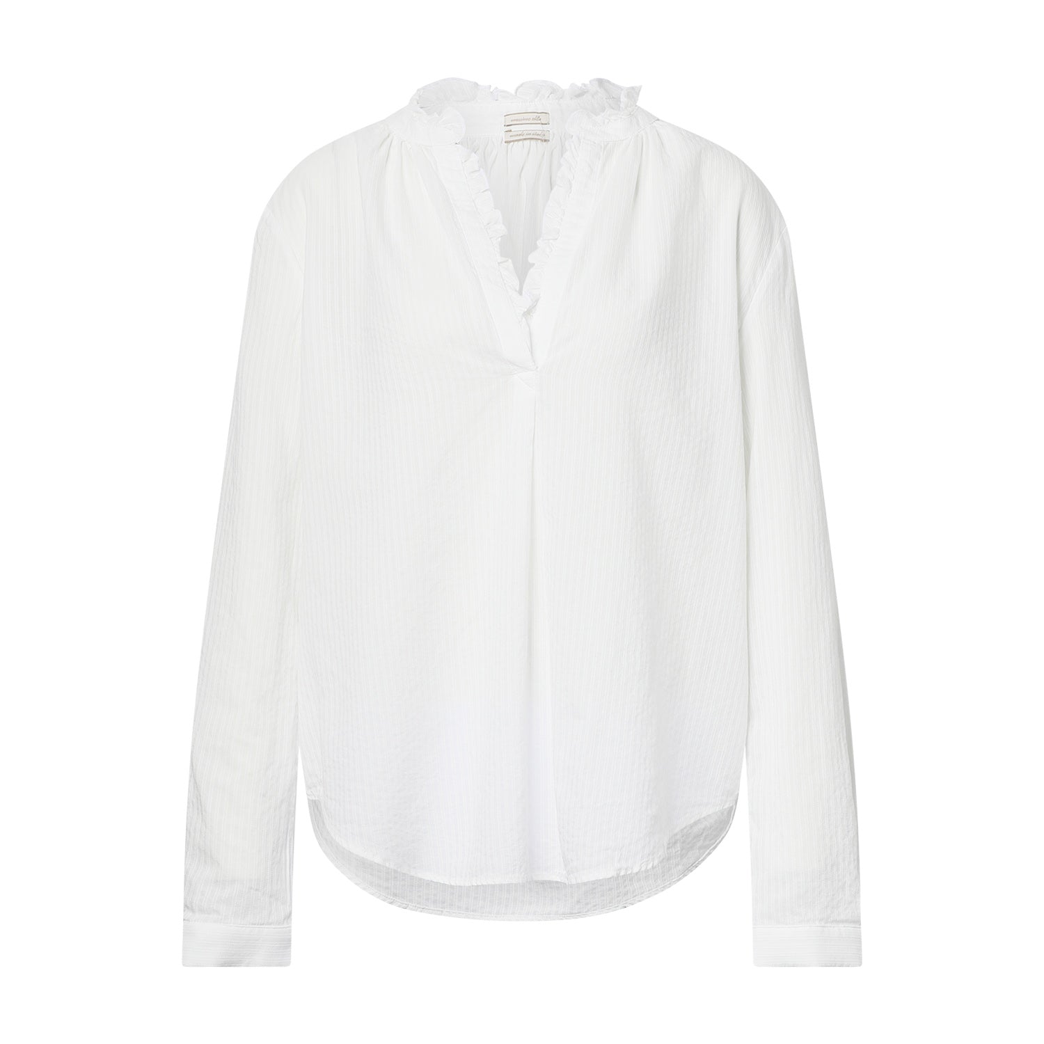 Erleben Sie das perfekte Zusammenspiel aus entspanntem Komfort und femininem Chic. Dieses in Italien gefertigte Blusenshirt besticht durch seine hochwertige Baumwolle und eine besondere Stoffstruktur, die dem Look eine edle Tiefe verleiht. Die lockere Passform umspielt sanft die Silhouette, während der gerüschte V-Ausschnitt einen verspielten Akzent setzt und Ihr Dekolleté gekonnt betont.