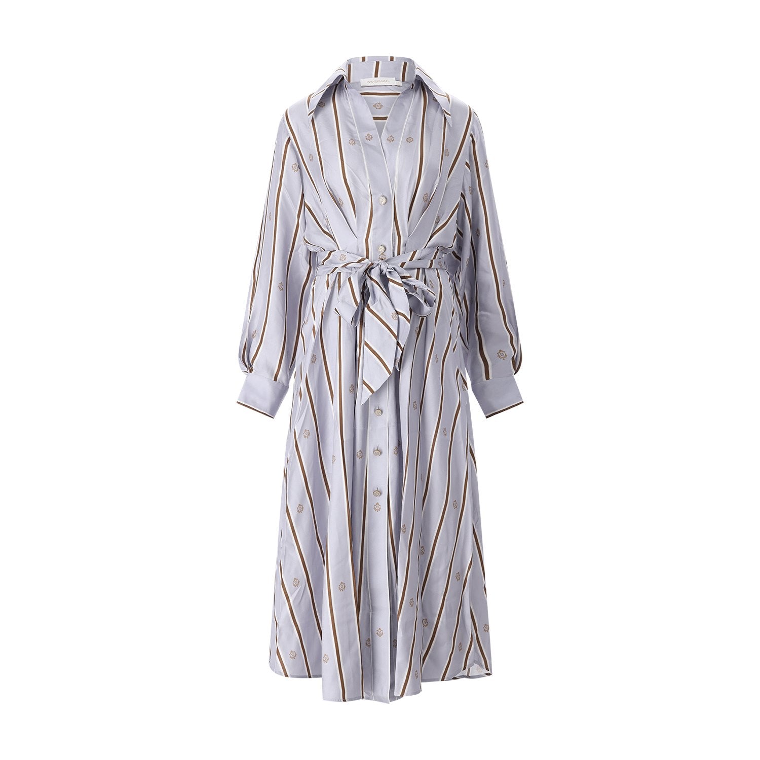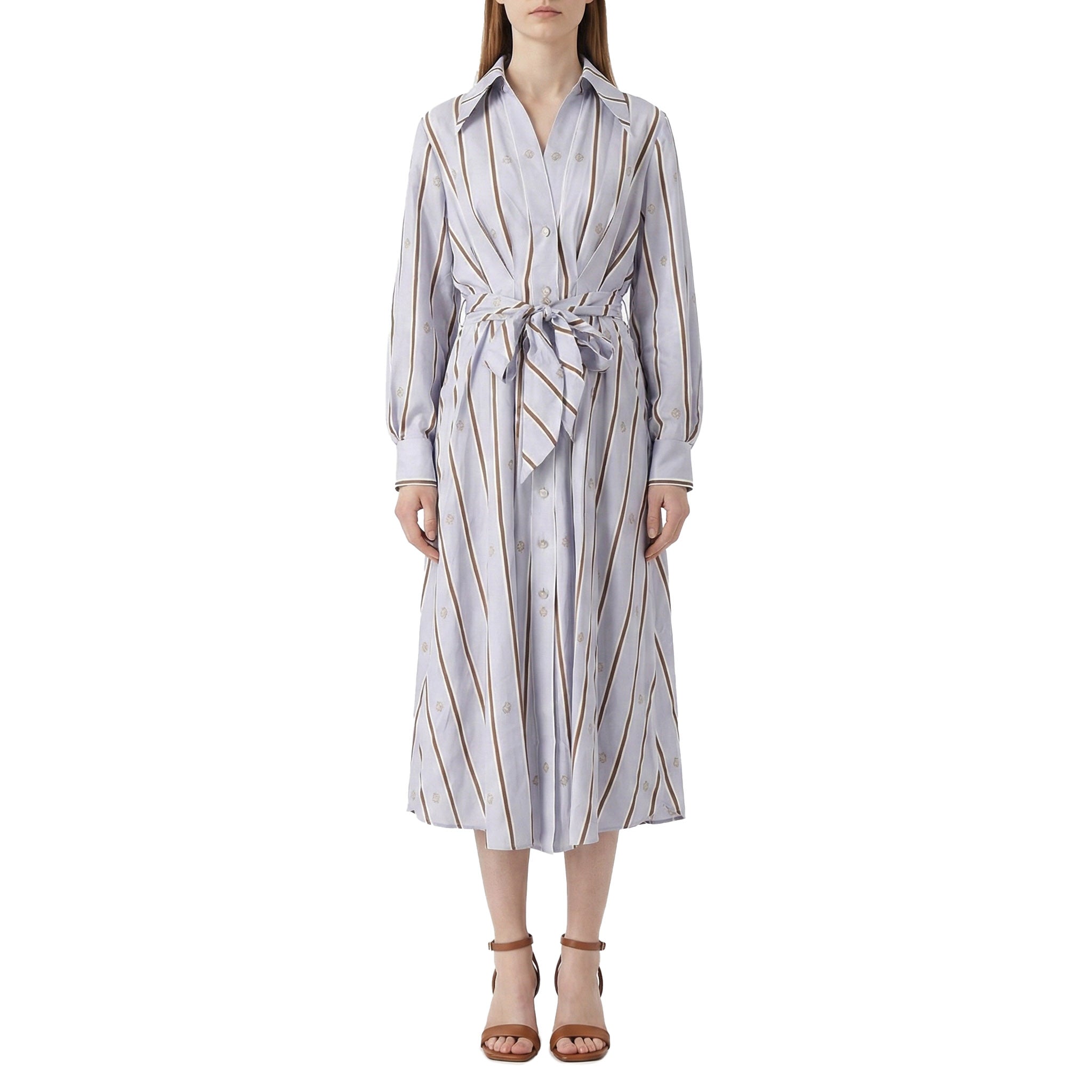 Erleben Sie pure Eleganz mit diesem exquisiten Midikleid aus feinster Seide. Das Design besticht durch ein harmonisches Zusammenspiel aus klassischem Streifen-Look und dezentem Logo-Muster, das für eine moderne, luxuriöse Note sorgt. Dank des taillierten Schnitts mit passendem Bindeband lässt sich die Silhouette individuell betonen und perfekt in Szene setzen. Hochwertige Logo-Knöpfe runden das exklusive Erscheinungsbild ab und machen dieses Kleid zum idealen Begleiter für besondere Anlässe.