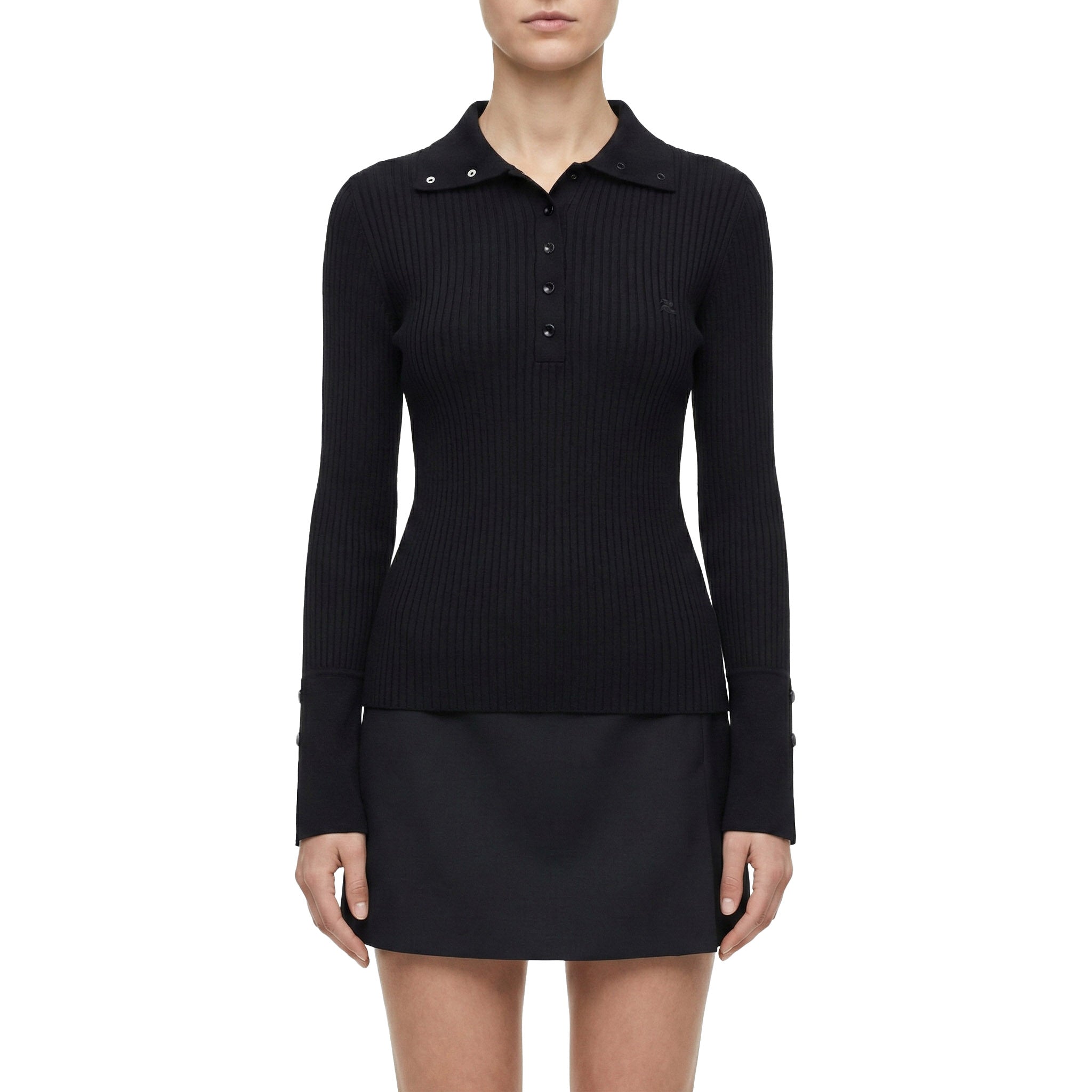 Dieses figurbetonte Shirt aus weichem, geripptem Stoff kombiniert einen eleganten Kragen mit Knopfleiste und eine dezente, monochrome Logo-Stickerei. Der feminine Schnitt betont die Silhouette, während das zeitlose Design vielseitige Styling-Möglichkeiten eröffnet.