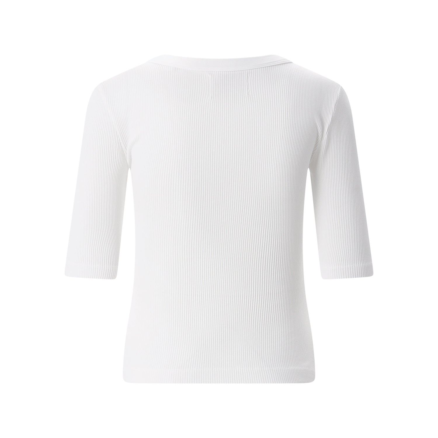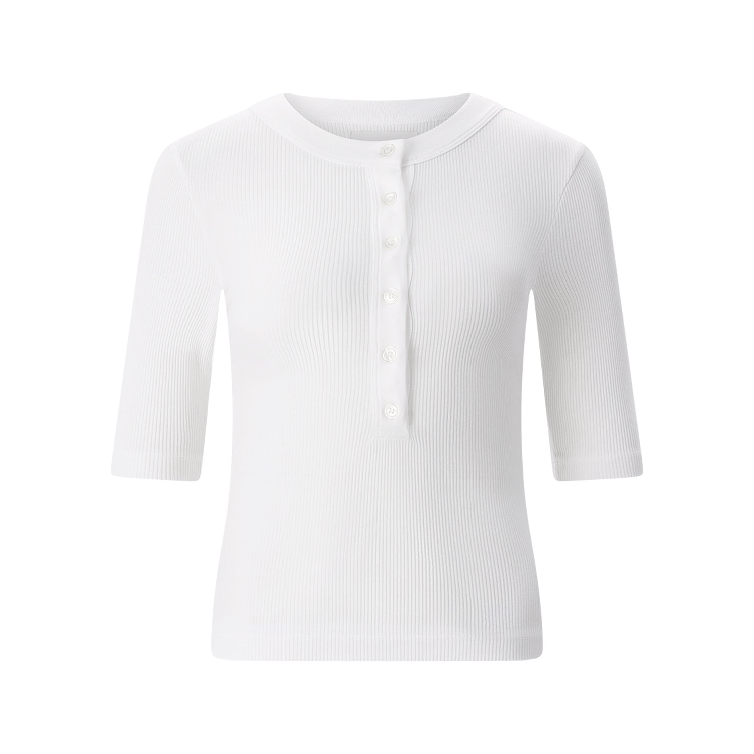 Dieses T-Shirt ist die ideale Verbindung aus Komfort und femininer Passform. Das Design in enger Schnittführung setzt Ihre Silhouette perfekt in Szene, während der hochwertige Baumwollmix für ein weiches, atmungsaktives Tragegefühl sorgt. Ein optisches Highlight ist die Knopfleiste, die von oben bis zur Mitte verläuft und dem klassischen Look eine sportive Note verleiht. Die feine Ripp-Struktur macht das Shirt besonders elastisch und vielseitig.
