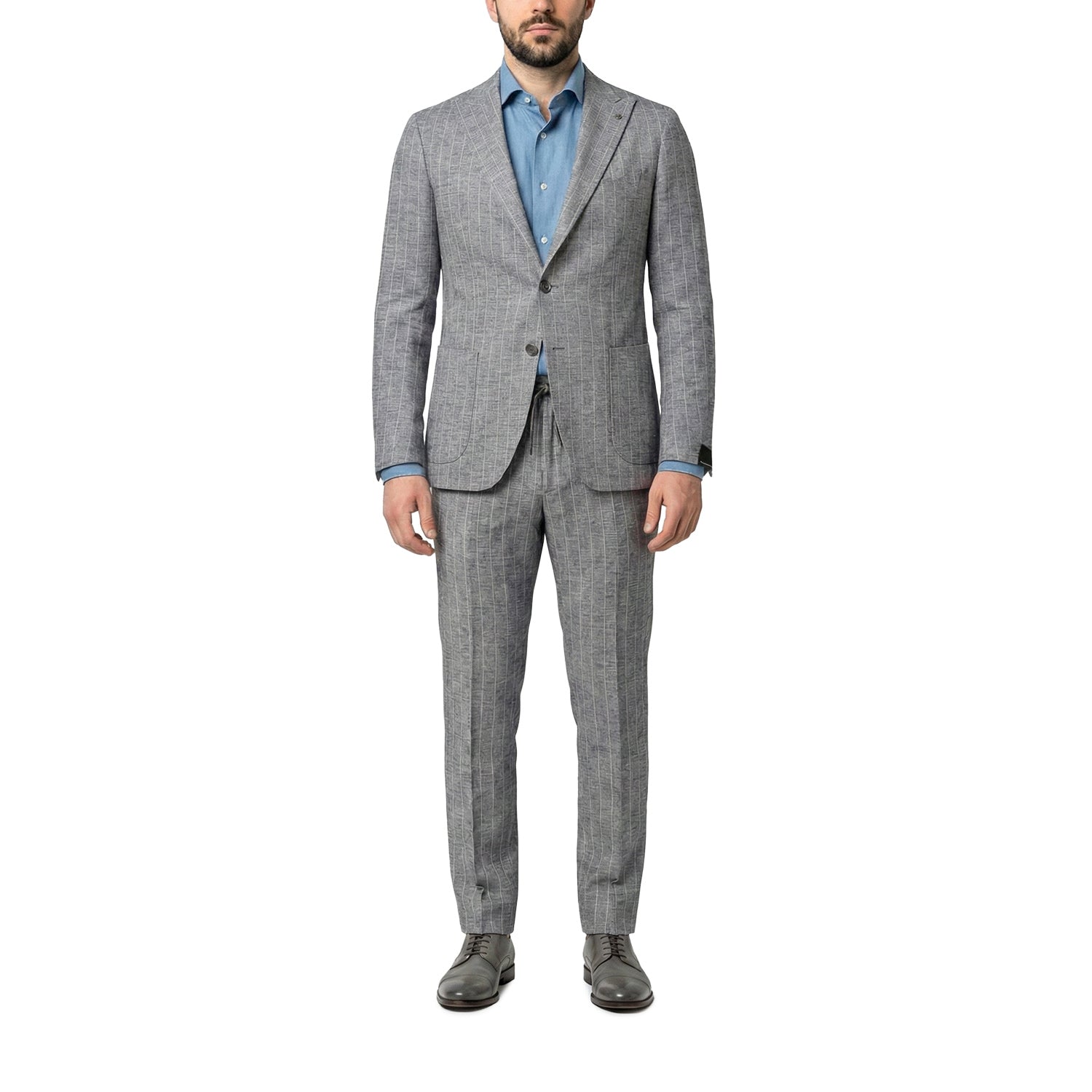 Dieser zweiteilige Anzug aus hochwertiger Schurwolle bietet nicht nur eine schlanke Passform, sondern auch eine stilvolle Reverskragen mit Logo-Detail und Kissing Buttons an der Jacke. Praktisch ergänzt wird das Sakko dank aufgesetzten Taschen. Die Hose schließt mit Knopf und einem Reißverschluss, hat praktische seitliche Eingriffstaschen und einen elastischen Bund mit Schnürung. Der weiche Stoff mit Längsstreifen sorgt für maximalen Tragekomfort.