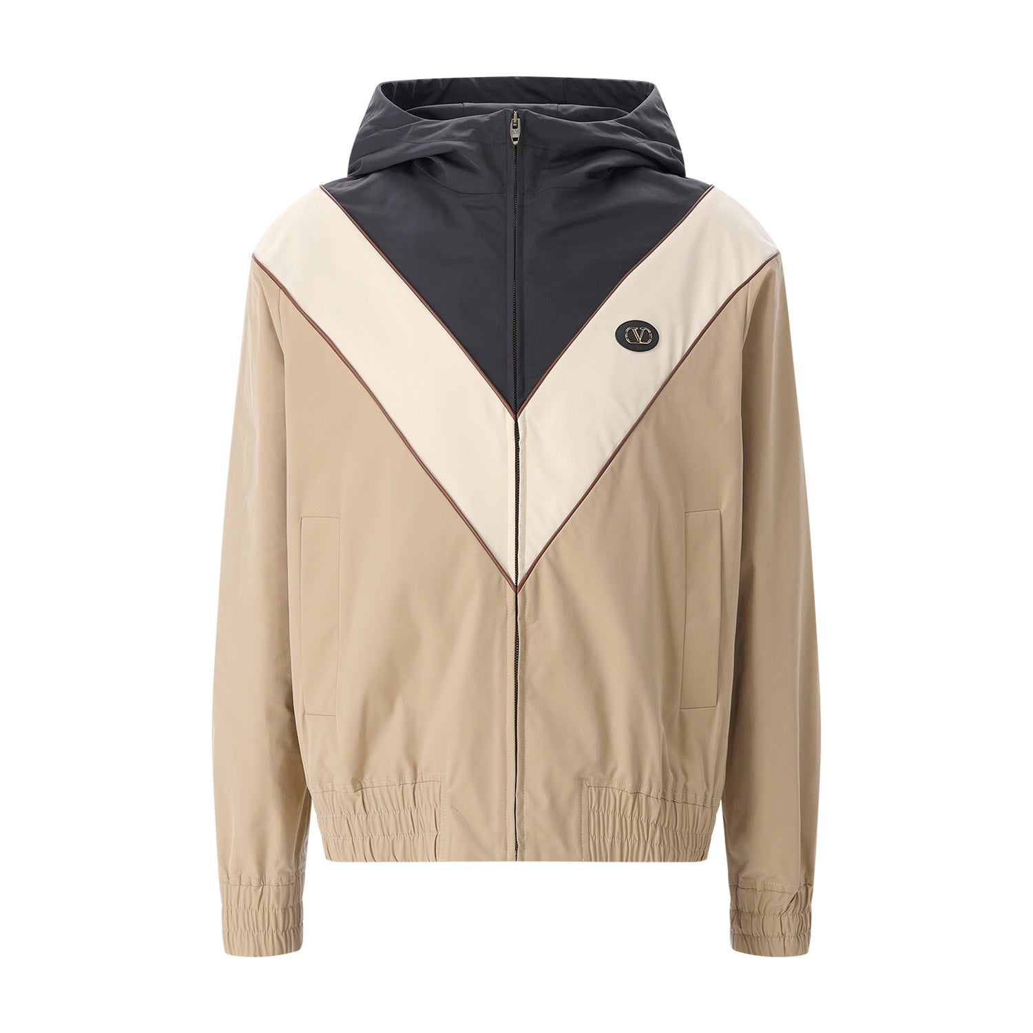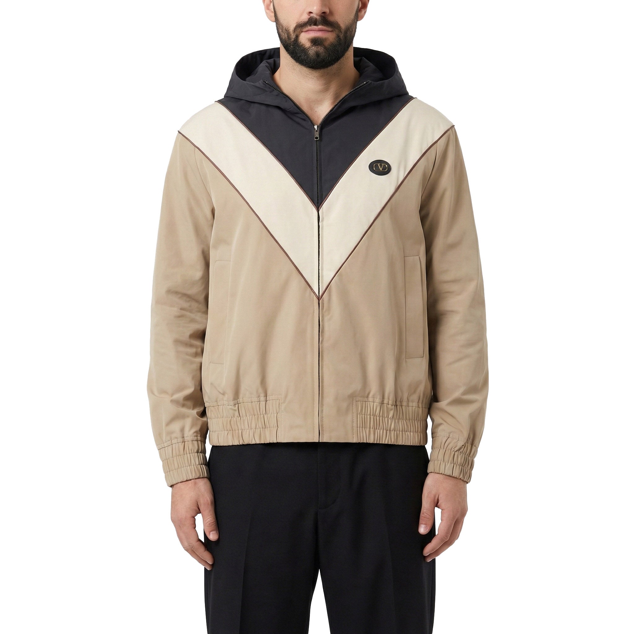 Diese in Italien gefertigte Kapuzenjacke von Valentino verbindet eine sportive Silhouette mit der für das Haus typischen Eleganz. Das Design besticht durch ein prägnantes, V-förmiges Streifenmotiv auf der Vorder- und Rückseite das durch einen dezenten VLogo-Aufnäher auf der Brust stilvoll abgerundet wird. Die durchdachte Ausstattung umfasst eine Kapuze mit verstellbarem Kordelzug, einen praktischen Front-Reißverschluss sowie elegante Paspeltaschen. Für eine perfekte Passform und Schutz vor Wind sorgen die elastischen Bündchen an Ärmeln und Saum.