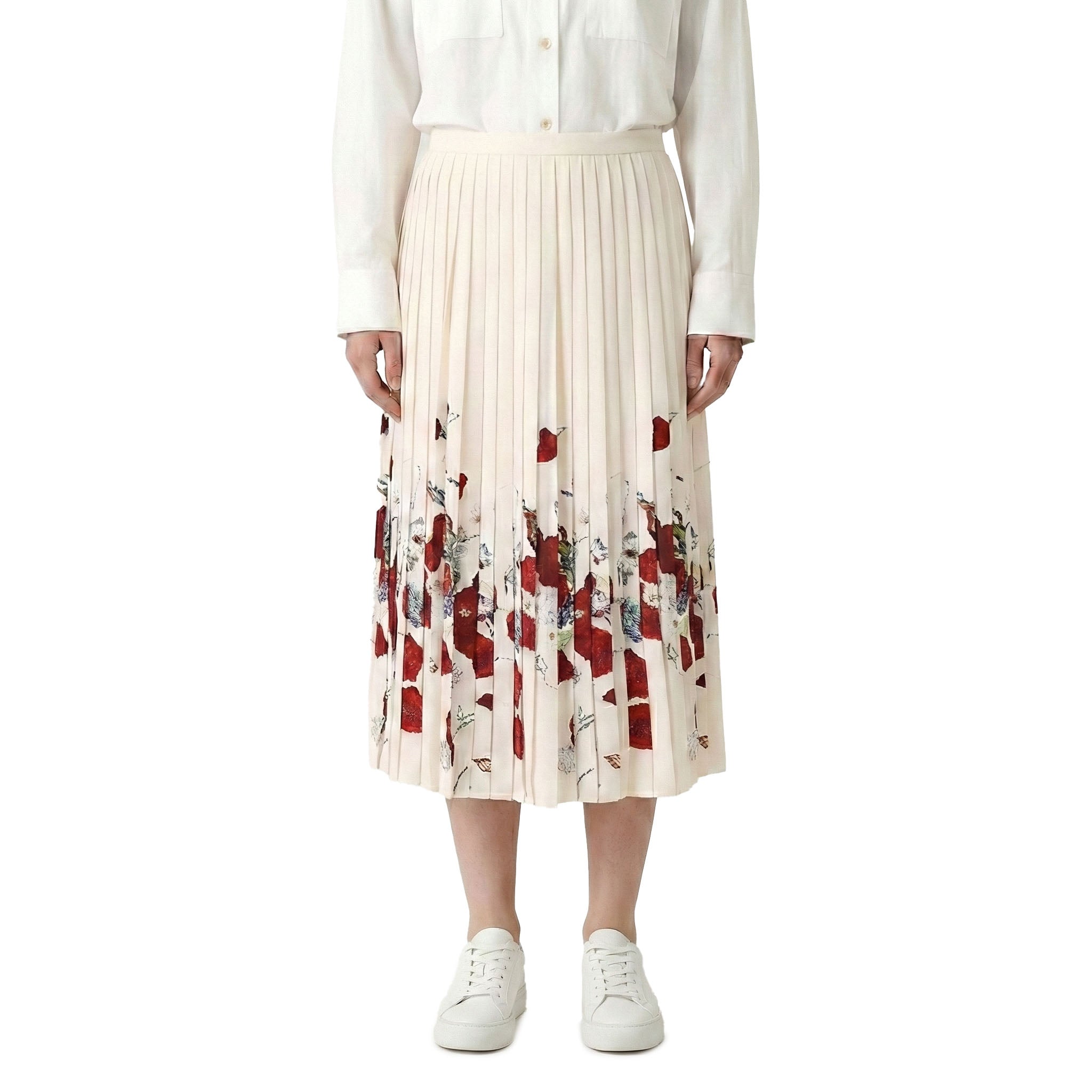 Dieser knieumspielende Midirock aus fein gearbeitetem Twill besticht durch präzise gesetzte, messerscharfe Falten, die ihm eine elegante Struktur verleihen. Ein kunstvoll platzierter floraler Print umrahmt das Design und bringt lebendige Leichtigkeit ins Spiel. Die von Hand ausgearbeiteten, sanft verlaufenden Falten zitieren stilvoll die Uniform-Ästhetik der 1940er-Jahre. Ein außergewöhnliches Statement-Piece, das moderne Raffinesse mit nostalgischer Eleganz vereint.