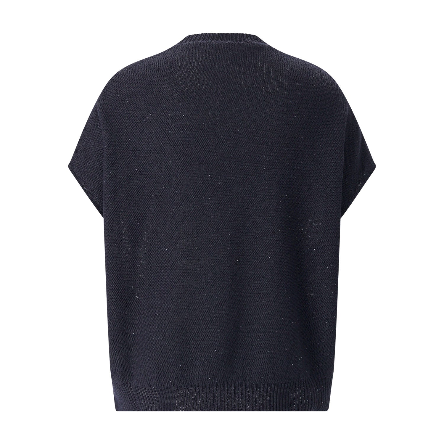 Dieser Pullunder aus einem hochwertigen Baumwollmix vereint natürliche Textur mit hoher Formbeständigkeit. Der klassische Rundhals-Ausschnitt und das zeitlose Design werden durch wenige, filigrane Mini-Pailletten veredelt, die dem Modell einen dezenten, edlen Schimmer verleihen.