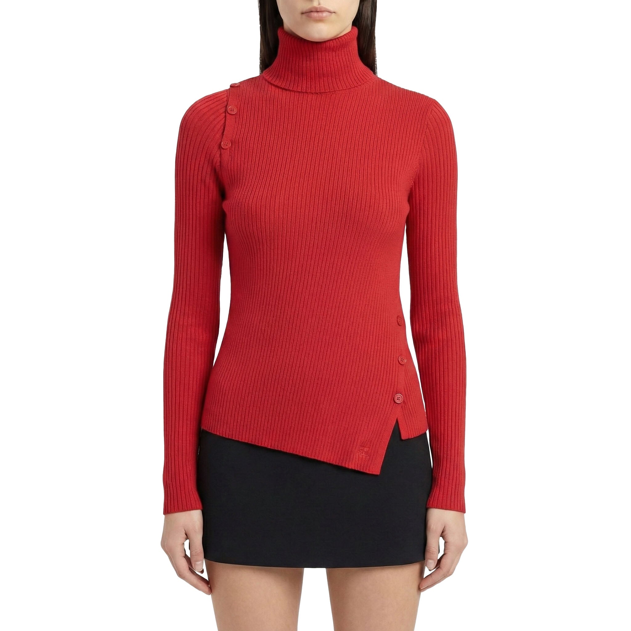 Dieser Slim-Fit-Pullover mit Stehkragen vereint modernes Design mit markanten Details: Dekorative Knopfausschnitte an Schulter und Seite, asymmetrischer Schnitt und Ripped-Strick verleihen ihm Charakter, während ein gesticktes Logo am Saum das minimalistische Design stilvoll abrundet