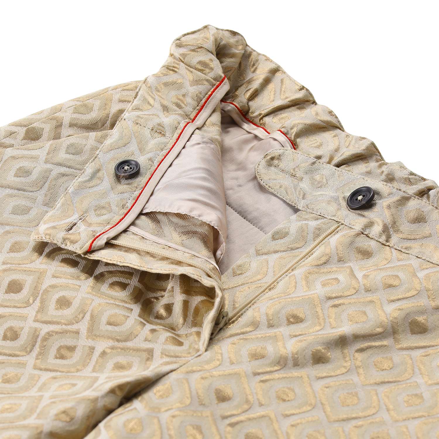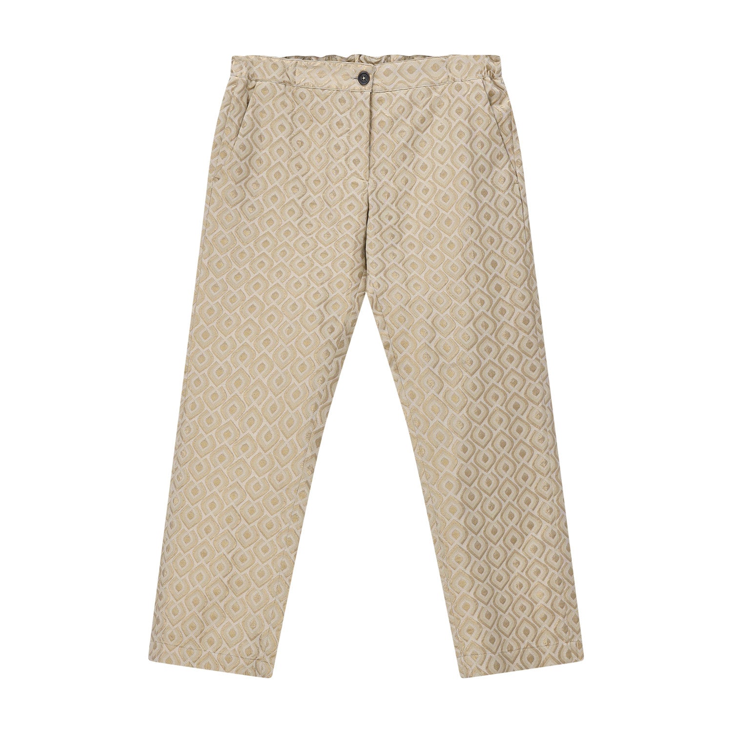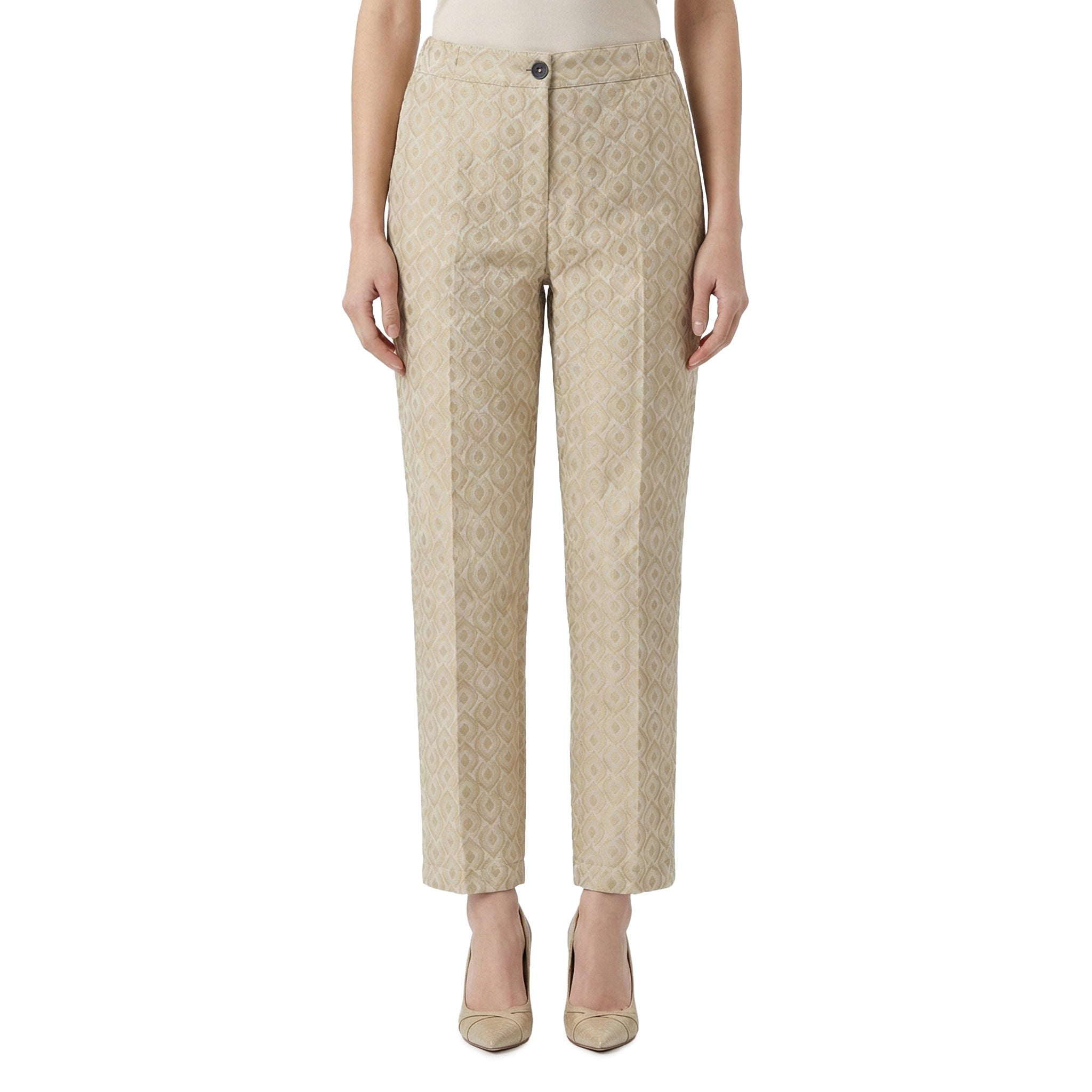 Verleihen Sie Ihrem Look das gewisse Etwas mit dieser exklusiven, in Italien gefertigten Stoffhose. Das Highlight ist die besondere Stoffstruktur mit metallisiertem Garn, die bei jeder Bewegung dezent schimmert und für eine luxuriöse Optik sorgt. Für perfekten Tragekomfort kombiniert das Design einen klassischen Verschluss aus Knopf und Reißverschluss mit einem teilelastischen Bund, der sich Ihrer Figur ideal anpasst.