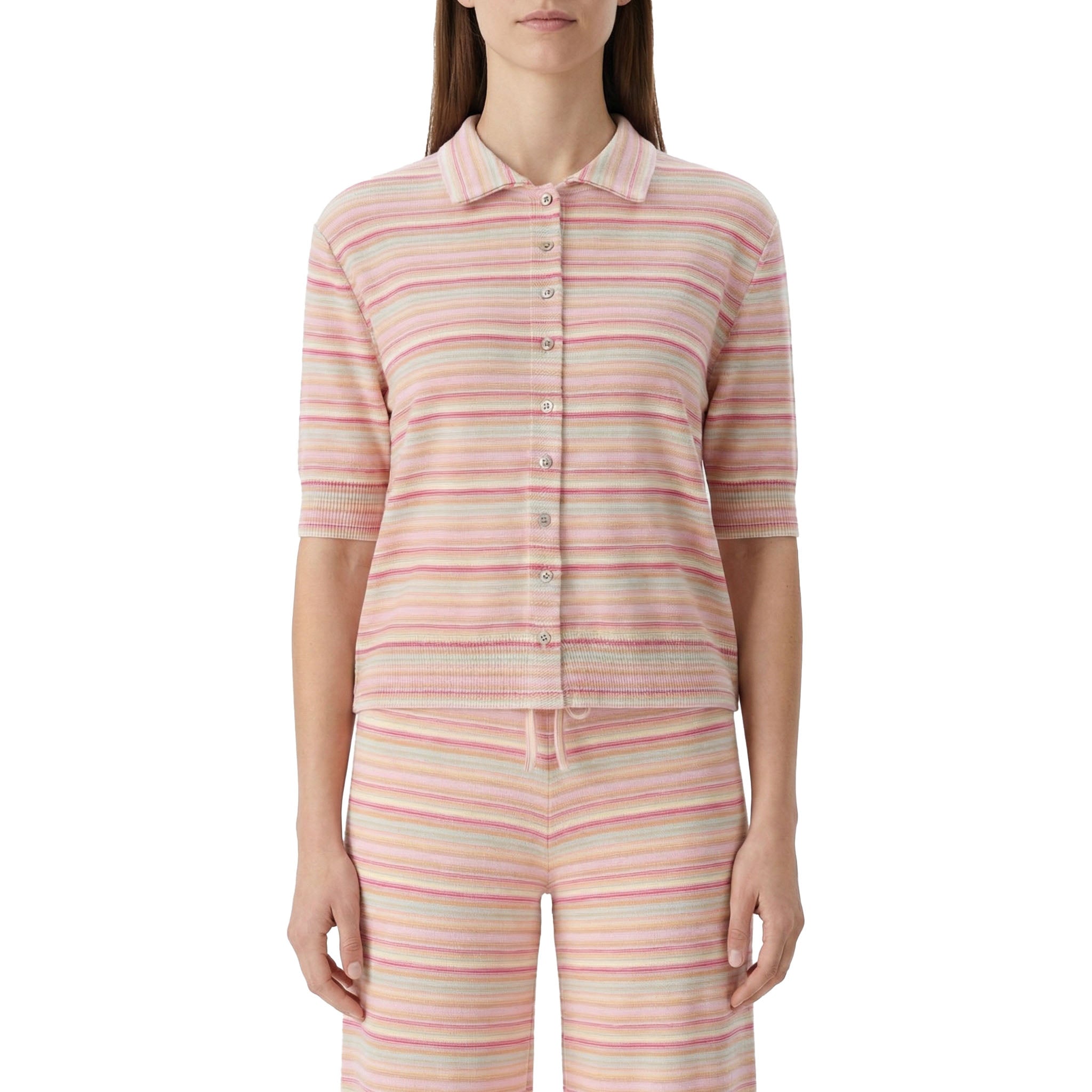 Diese Kurzarm Strickjacke setzt auf ein klares Design und hochwertige Qualität. Gefertigt aus reiner Merinowolle, ist er weich auf der Haut und bietet einen hohen Tragekomfort. Das dynamische, mehrfarbige Streifenmuster verleiht dem Modell eine moderne Optik, während der kurze, kastige Schnitt für eine zeitgemäße Silhouette sorgt. Der integrierte Kragen und die Knopfleiste verleihen dem Stück eine klassische Note und machen es zu einem vielseitigen Begleiter für gehobene Casual-Outfits.
