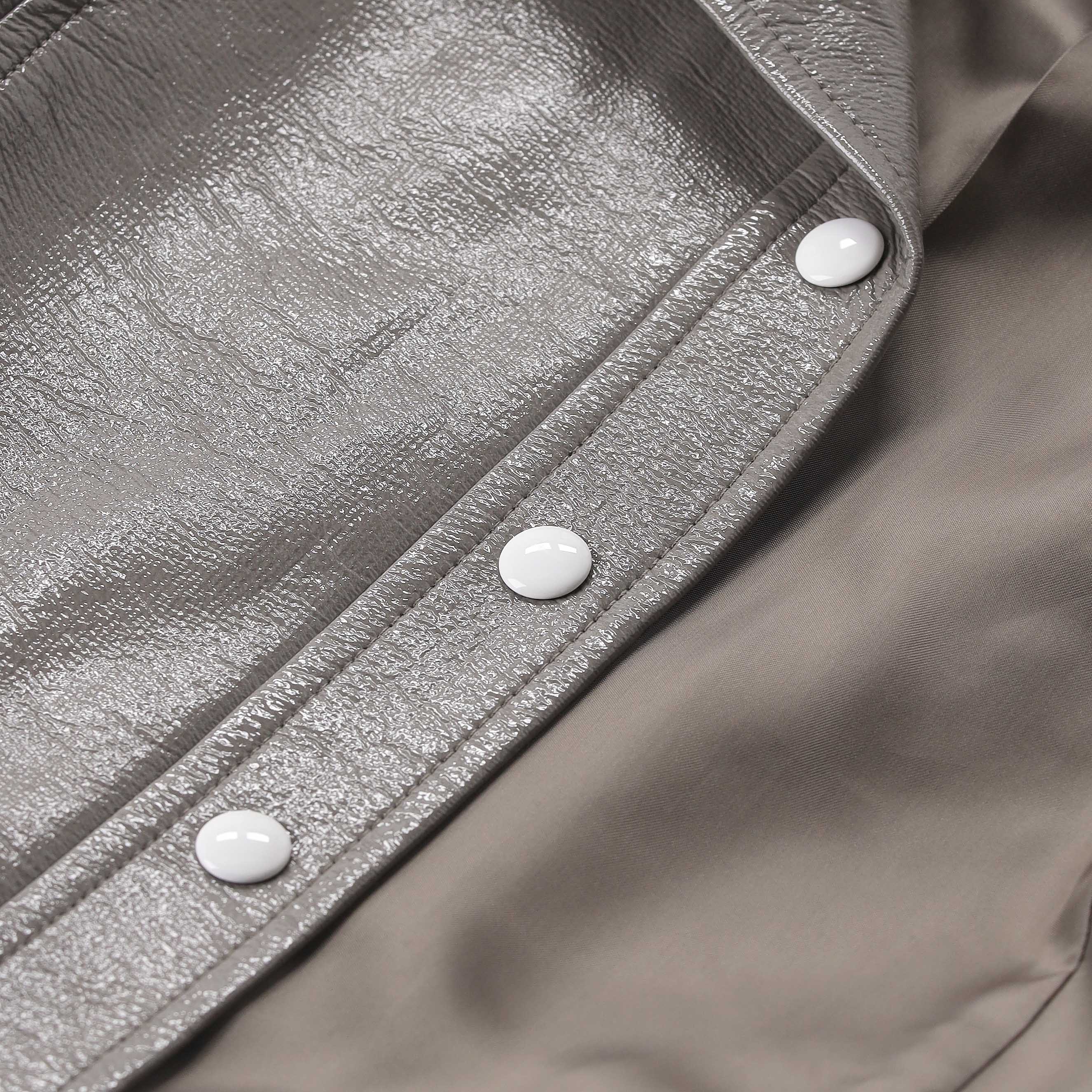 Diese Jacke ist ein ausdrucksstarkes Statement-Piece, das durch Materialität und präzise Schnittführung besticht. Gefertigt aus hochwertigem lackiertem Leder, besticht sie durch einen dezenten Glanz, der dem Design eine moderne, luxuriöse Tiefe verleiht. Ein besonderer Fokus liegt auf dem sorgfältig geformten Kragen, der der Jacke eine klare Struktur und eine souveräne Ausstrahlung verleiht. Das visuelle Highlight ist das große, weiße Logo auf der Brust, das einen markanten Kontrast zur glänzenden Oberfläche bildet.