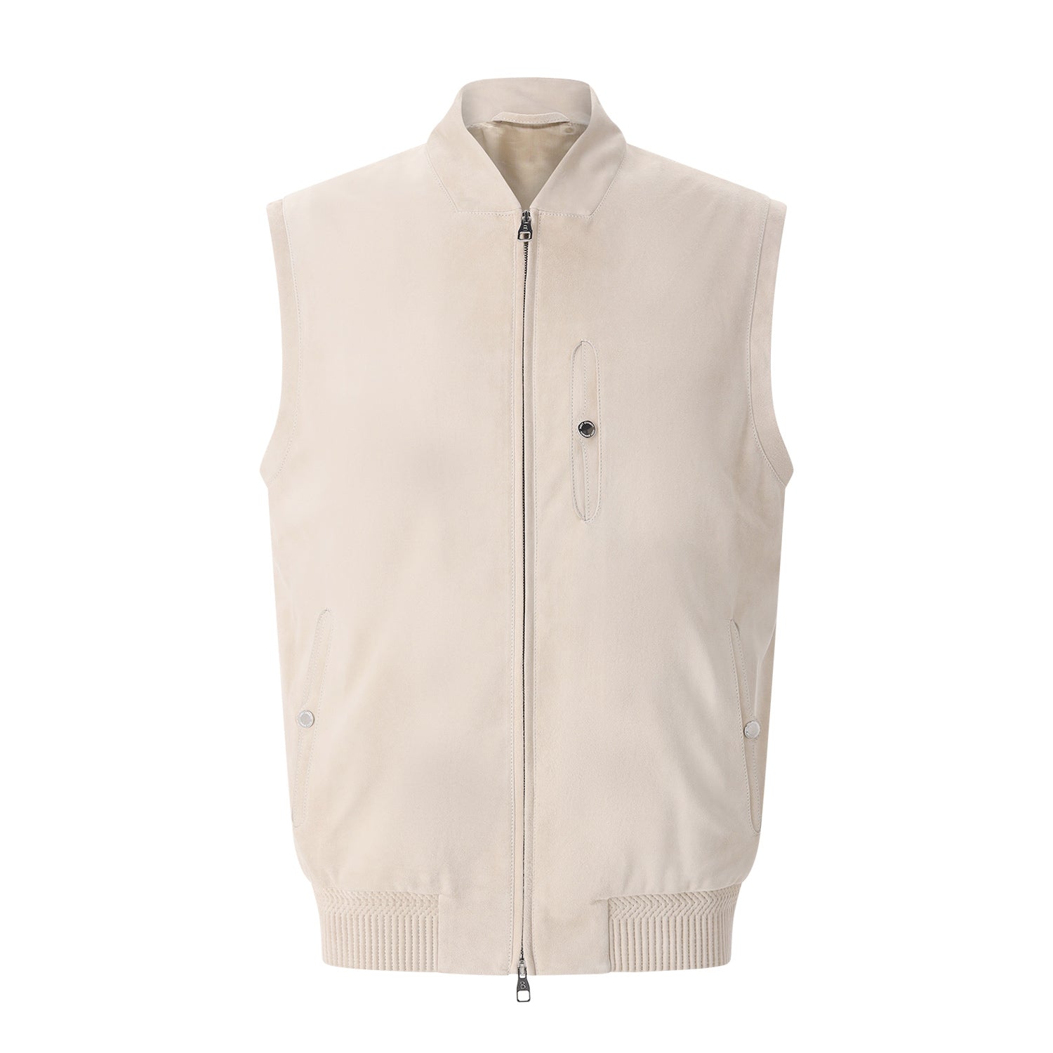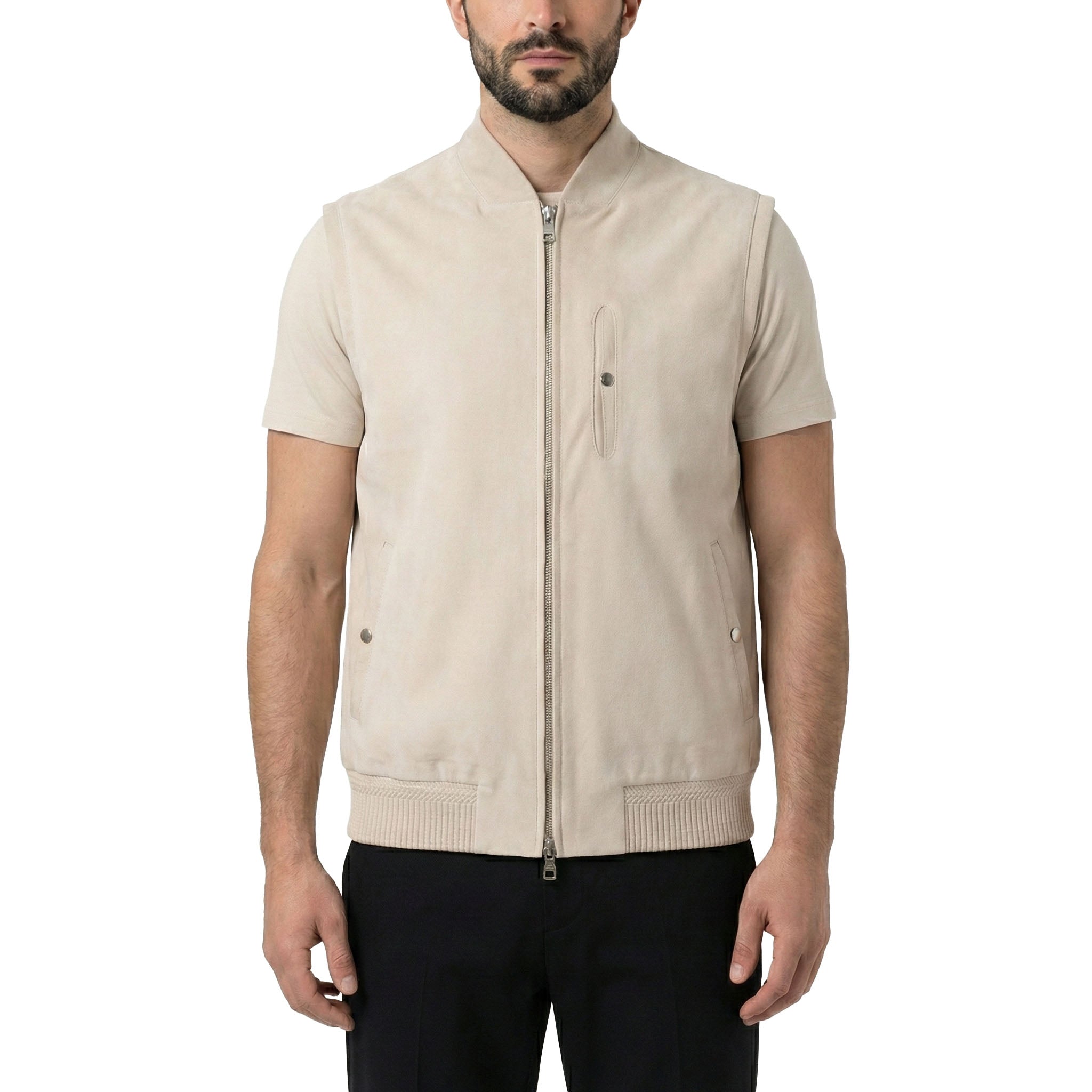 Diese Weste definiert gehobenen Stil neu. Gefertigt in Italien aus feinstem, samtweichen Veloursleder, vereint sie handwerkliche Perfektion mit modernem Design. Während der cleane Reißverschluss für eine markante Silhouette sorgt, setzen die Taschen mit Knopfverschluss edle Akzente.