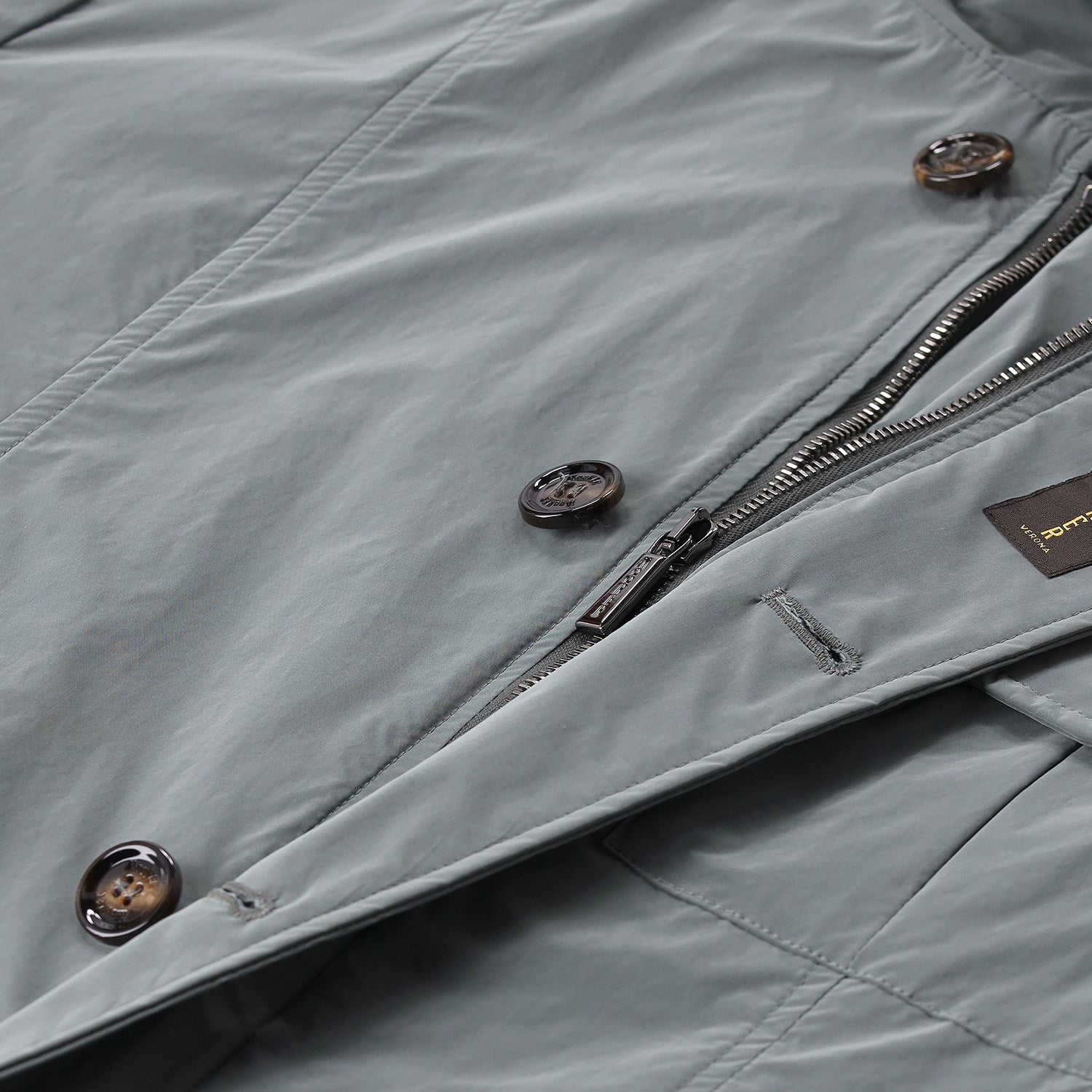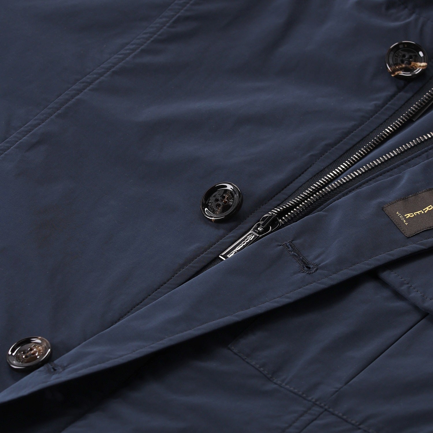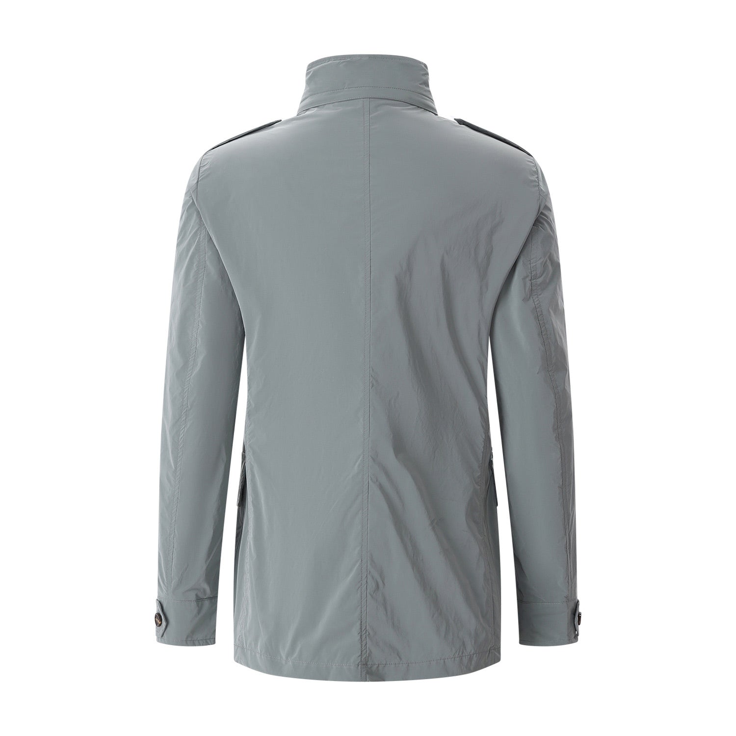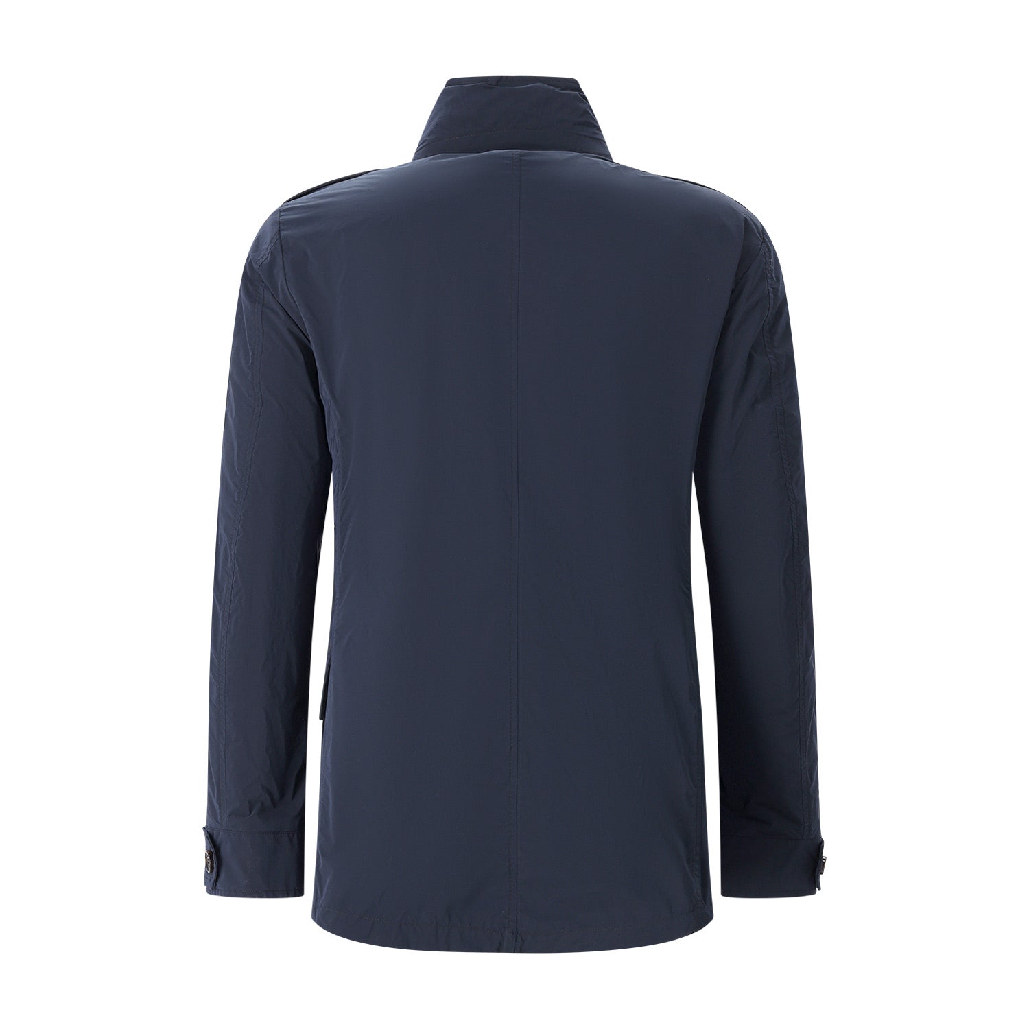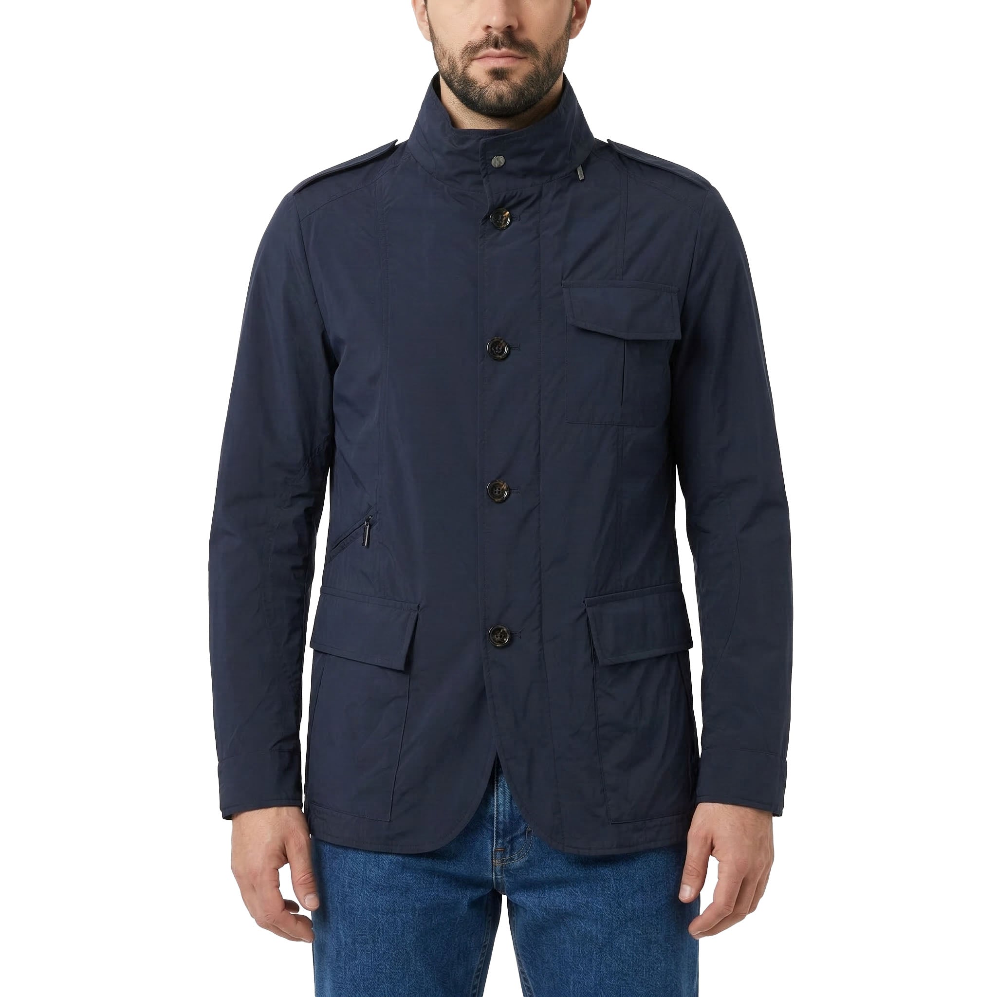 Die Jacke vereint funktionale Details mit höchster Schneiderkunst: Ein doppelter Verschluss aus Reißverschluss und Hornknöpfen sowie eine im Kragen versteckte, herausnehmbare Kapuze sorgen für maximale Vielseitigkeit. Ausgestattet mit praktischen Brusttaschen, Pattentaschen mit verdeckten Druckknöpfen und einer zusätzlichen kleinen Reißverschlusstasche, bietet sie großzügigen Stauraum. Klassische Schulterklappen, winddichte Bündchen und diskrete Innentaschen für Dokumente runden das Design ab. Ein meisterhaftes Piece, das italienische Eleganz und technische Raffinesse perfekt miteinander verbindet.
