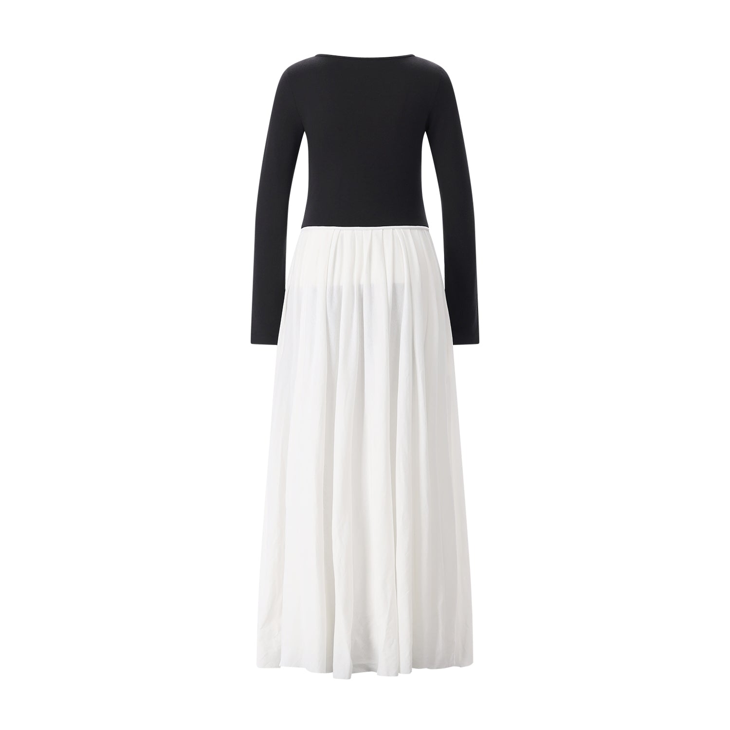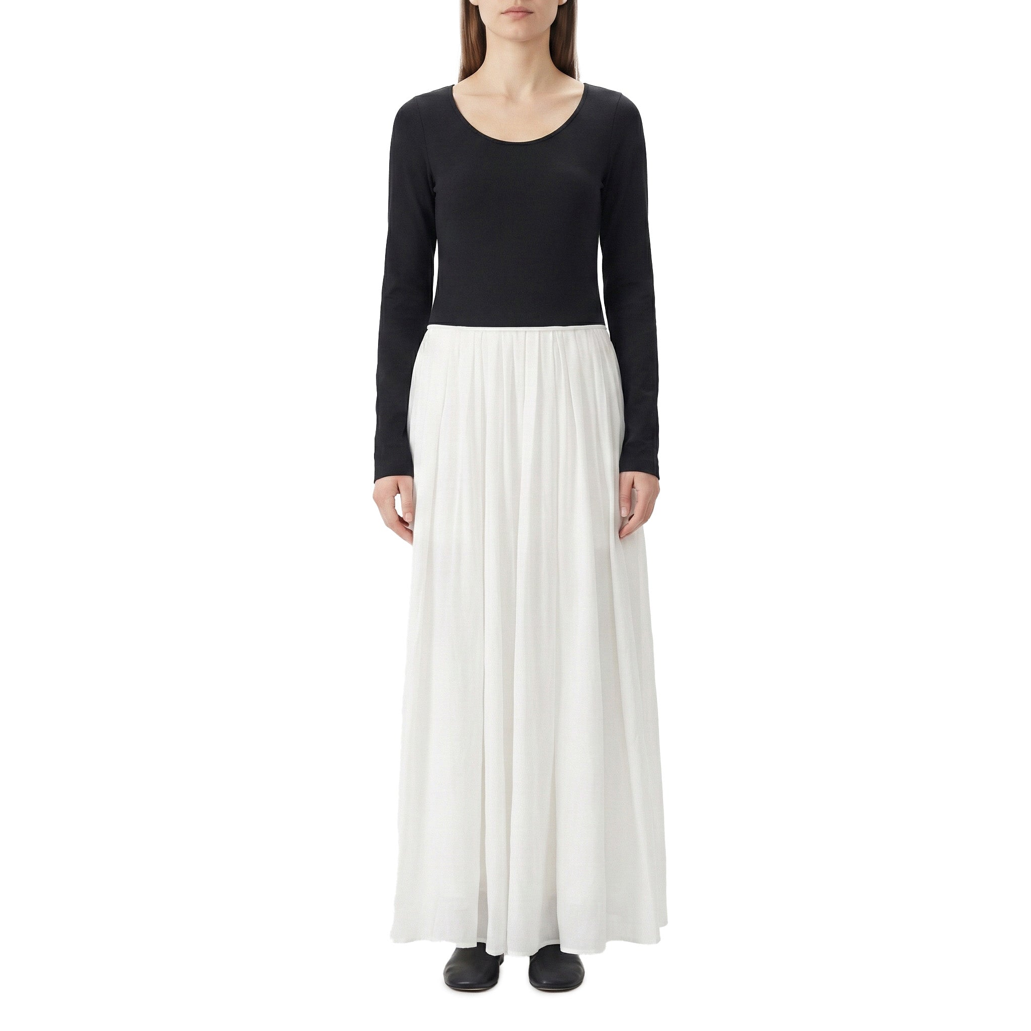 Dieses Kleid besticht durch ein faszinierendes Spiel der Kontraste: Das anschmiegsame Langarm-Oberteil mit tiefem Rundhalsausschnitt aus ökologischer japanischer Seide trifft auf einen markant plissierten Rock. Dank eines speziellen Salz-Finishes erhält der Baumwoll-Jersey eine einzigartige, papierartige Haptik. Ein seitlicher, verdeckter Reißverschluss vollendet die klare Silhouette dieses außergewöhnlichen Design-Stücks.
