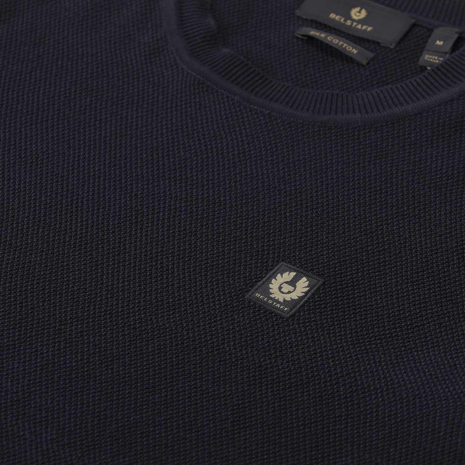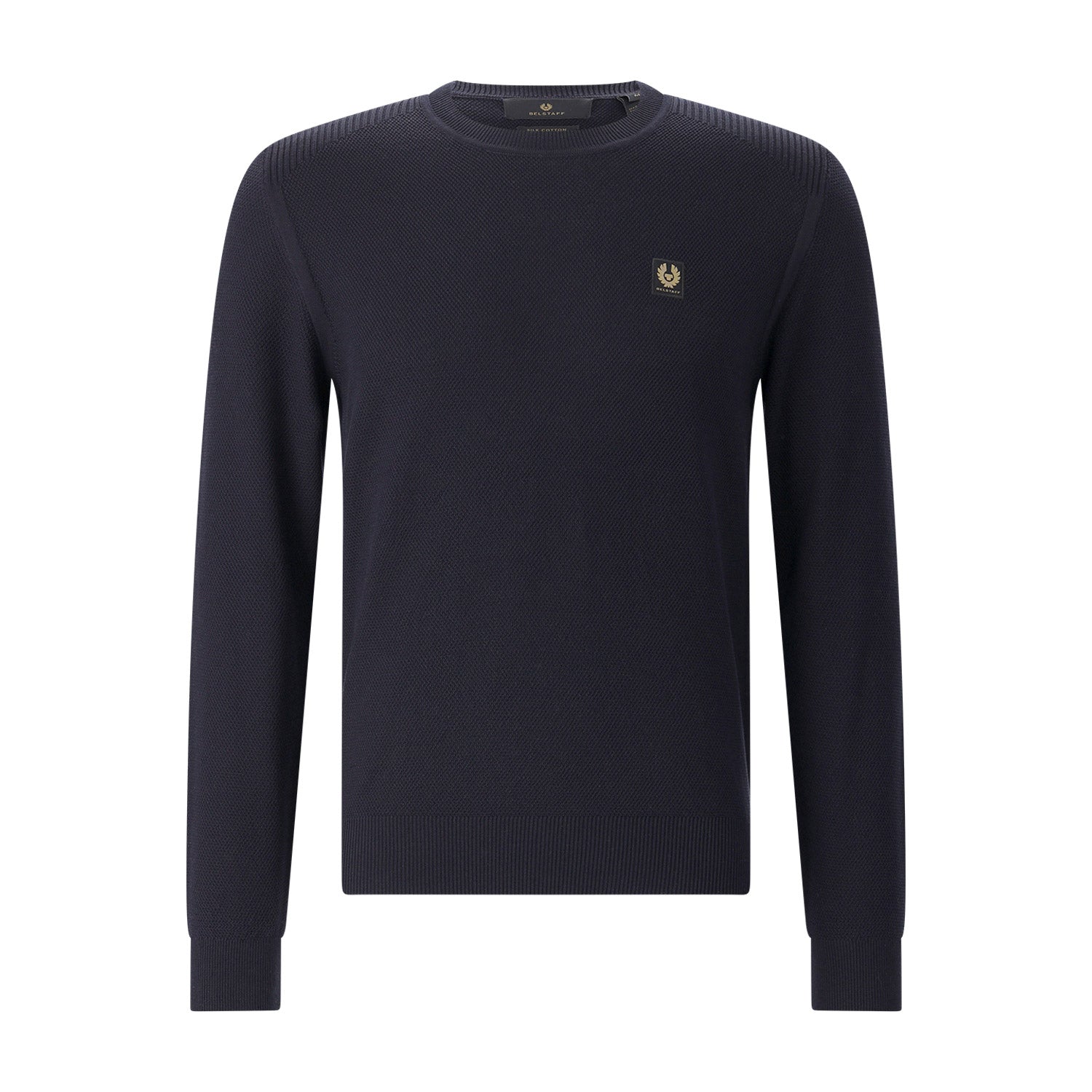 Dieser Strickpullover ist die perfekte Definition von modernem Luxus und funktionaler Eleganz. Das Besondere an diesem Modell ist die exquisite Komposition aus edler Seide und feinster Baumwolle. Das Design besticht durch minimalistisches Understatement. Der klassische Rundhalsausschnitt und die präzise gearbeiteten Rippbündchen an Ärmeln und Saum garantieren eine formstabile, maskuline Silhouette. Das ikonische Belstaff-Logo signalisiert die traditionsreiche Herkunft dieses Premium-Essentials