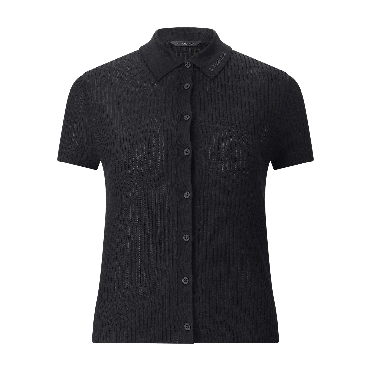 Diese Kurzarm Strickjacke ist die Definition von modernem Understatement. Gefertigt aus einem besonders feinen Viskose-Baumwoll-Rippstrick, schmiegt es sich sanft an die Silhouette an und bietet ein außergewöhnlich leichtes Tragegefühl. Der flache Kragen und die durchgehende Leiste mit 8 gravierten Balenciaga-Knöpfen verleihen dem Shirt eine cleane, architektonische Optik. Ein dezentes, aber wirkungsvolles Detail ist die präzise Logo-Stickerei direkt auf dem Kragen. Hergestellt in Italien, vereint dieses Oberteil hochwertige Strickkunst mit dem avantgardistischen Geist des Hauses.
