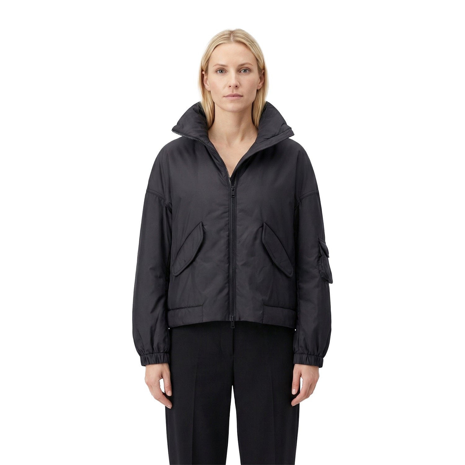 This slightly oversized bomber jacket offers exceptional comfort and protection from wind and weather. It features a two-way zipper, a stand-up collar, practical side pockets with snap closures, and a sleeve pocket. Inside, an adjustable elastic drawstring ensures a customized fit, while the water-repellent material provides pleasant warmth.