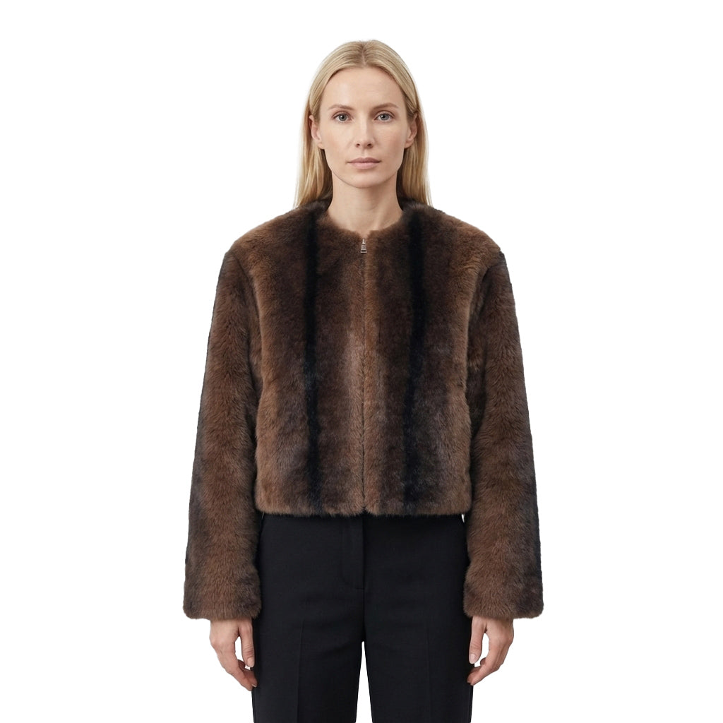 This jacket, crafted from soft faux fur, impresses with its straight silhouette and regular fit, combining timeless elegance with exceptional comfort. Featuring a practical zip closure and side pockets, it's a versatile companion for cool days.