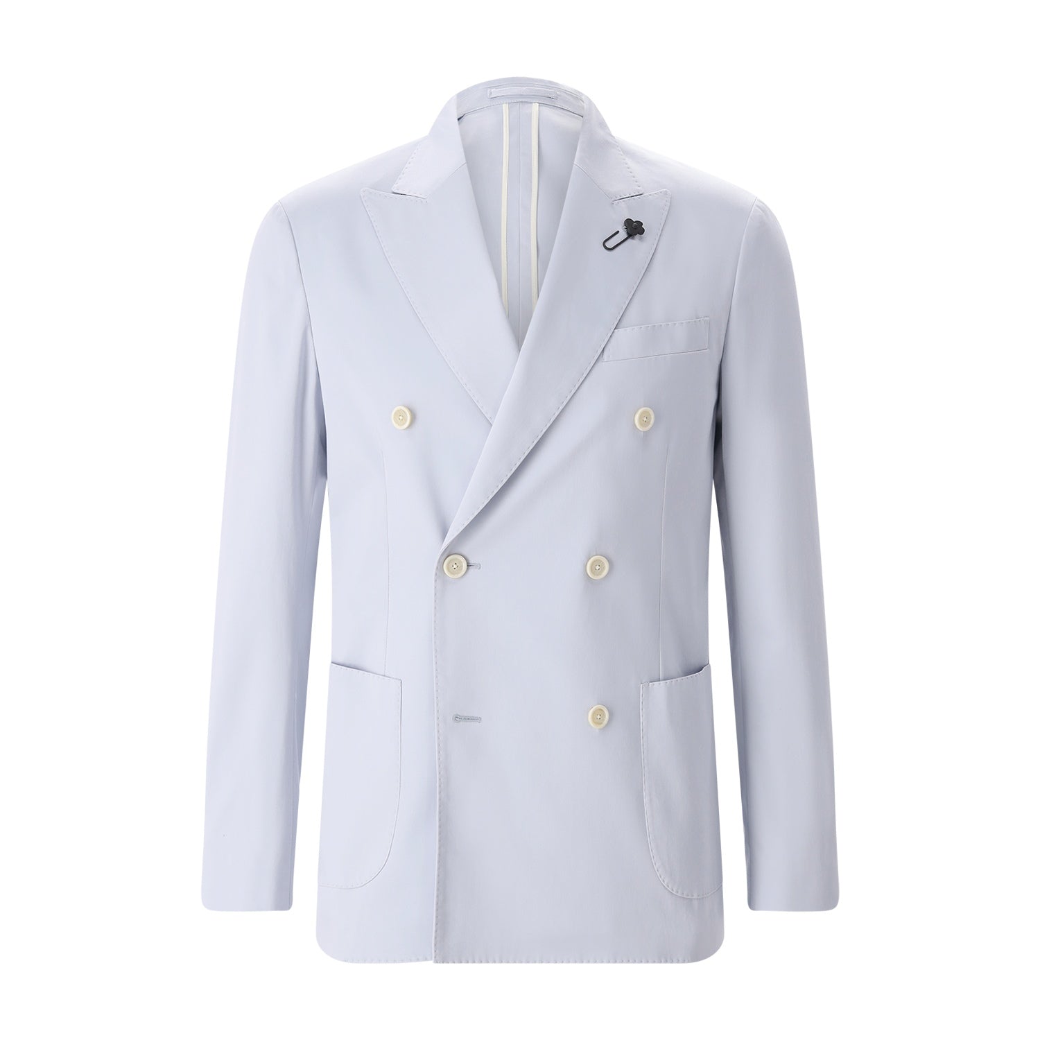 Dieses in Italien gefertigte Sakko interpretiert klassische Eleganz neu. Aus einem hochwertigen Baumwollmix mit glatter Stoffstruktur gefertigt, besticht es durch seine klare Optik und einen besonders gepflegten Griff. Das zweireihige Design sorgt für eine markante Silhouette, während die zwei Vordertaschen und die zusätzliche Brusttasche dem Modell eine zeitlose Struktur verleihen.