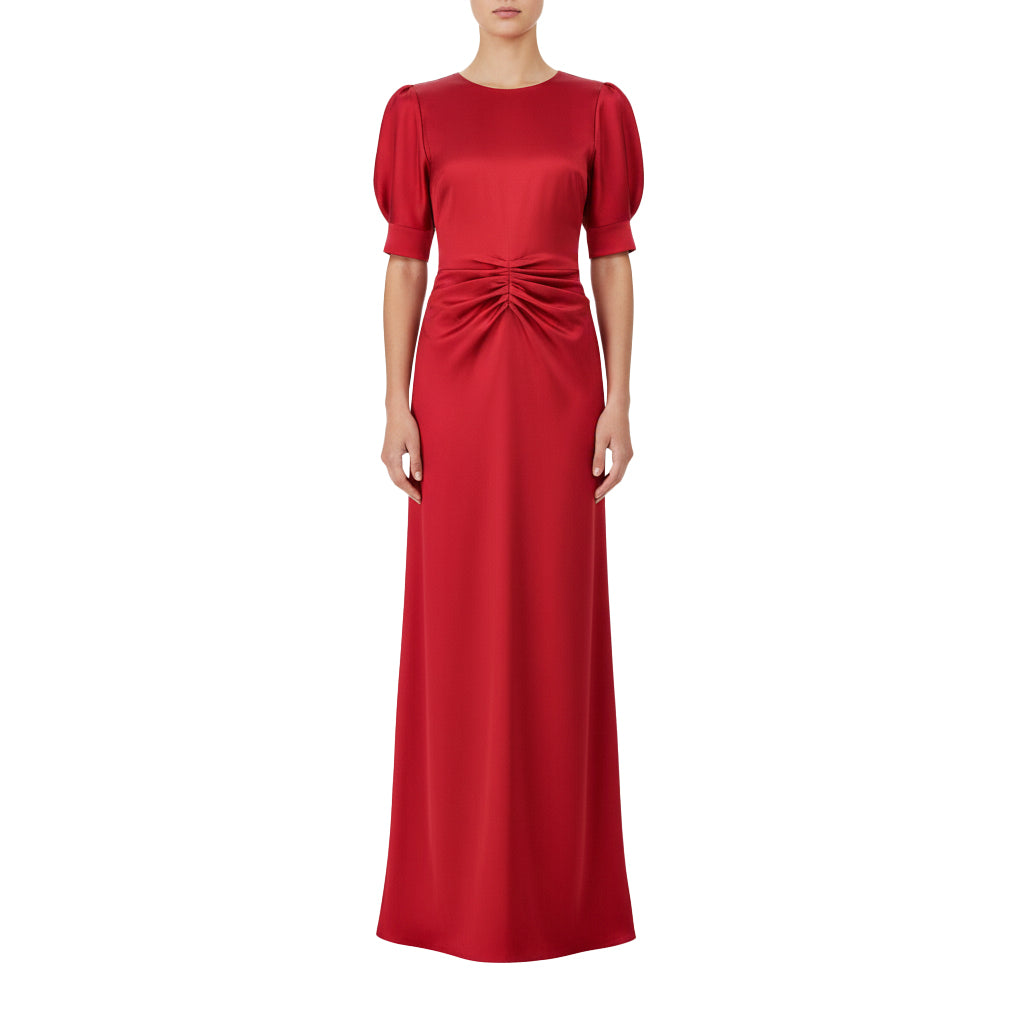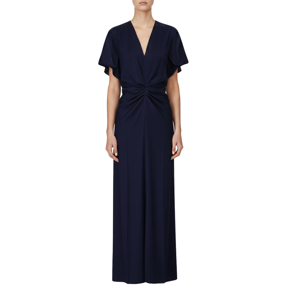 One of Victoria Beckham's iconic designs: This maxi dress impresses with its tailored fit and flowing bodice for a flattering, relaxed silhouette. Pleats at the waist and shoulders add elegant accents and texture, while precise pressed details in the skirt and shoulders provide subtle structure. Details such as exposed seams, contrasting quilting, and a longer back hem complete the look, creating a modern, feminine style full of sophistication.