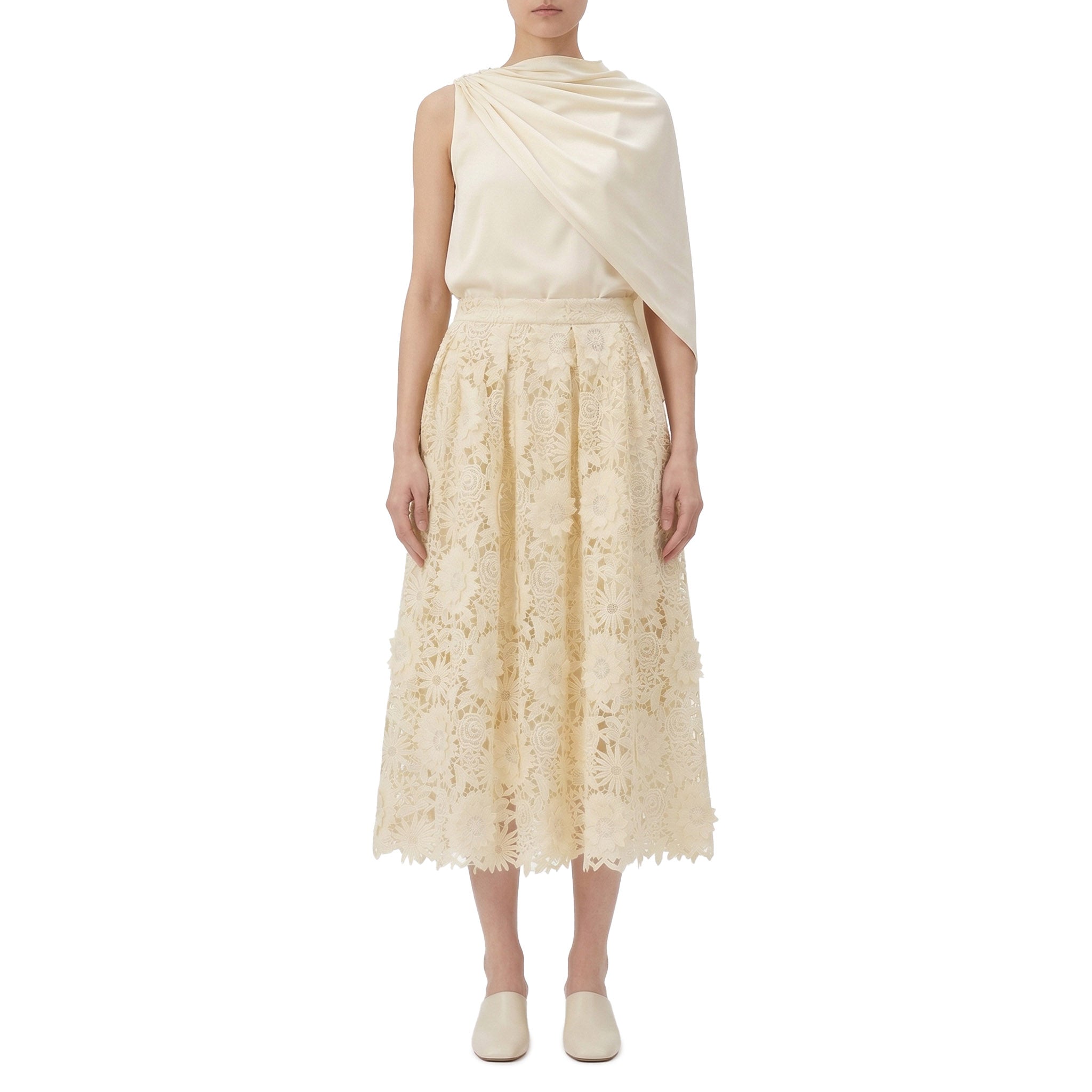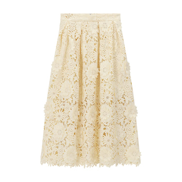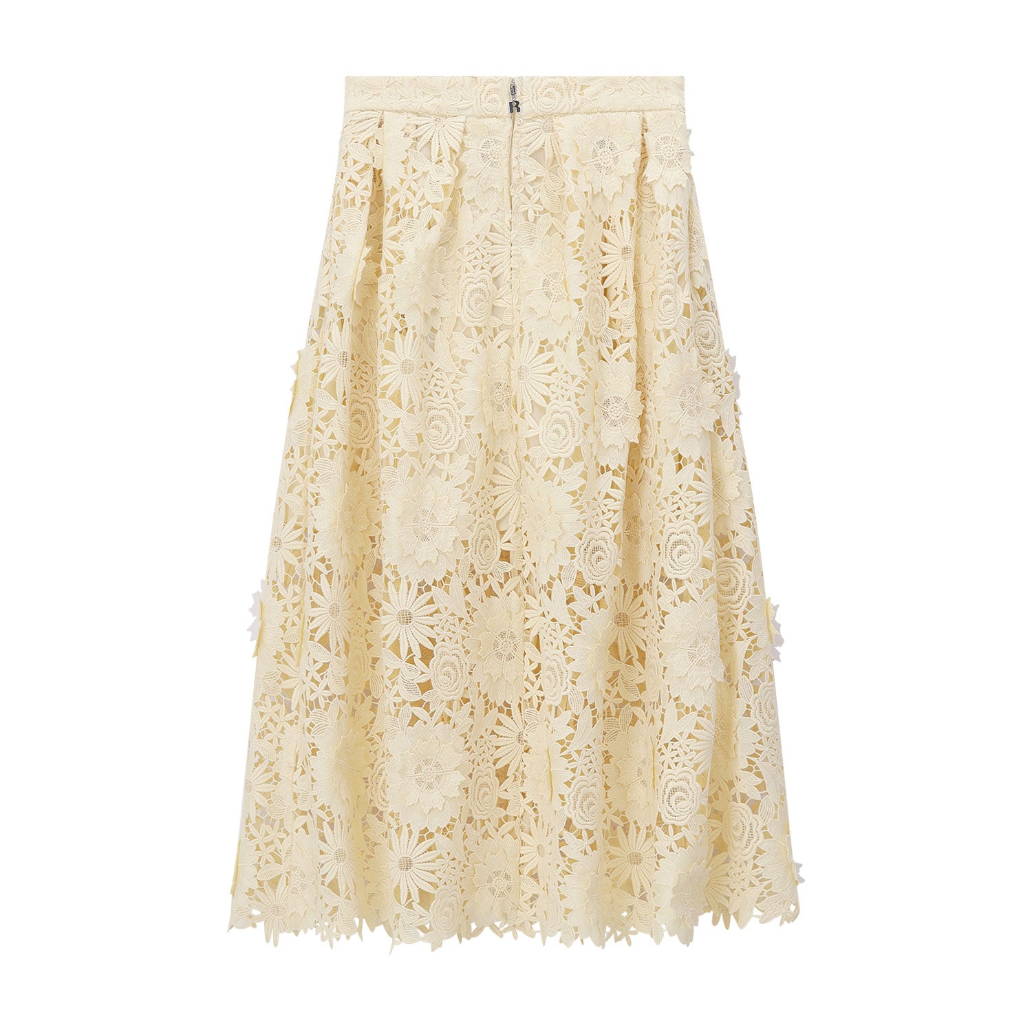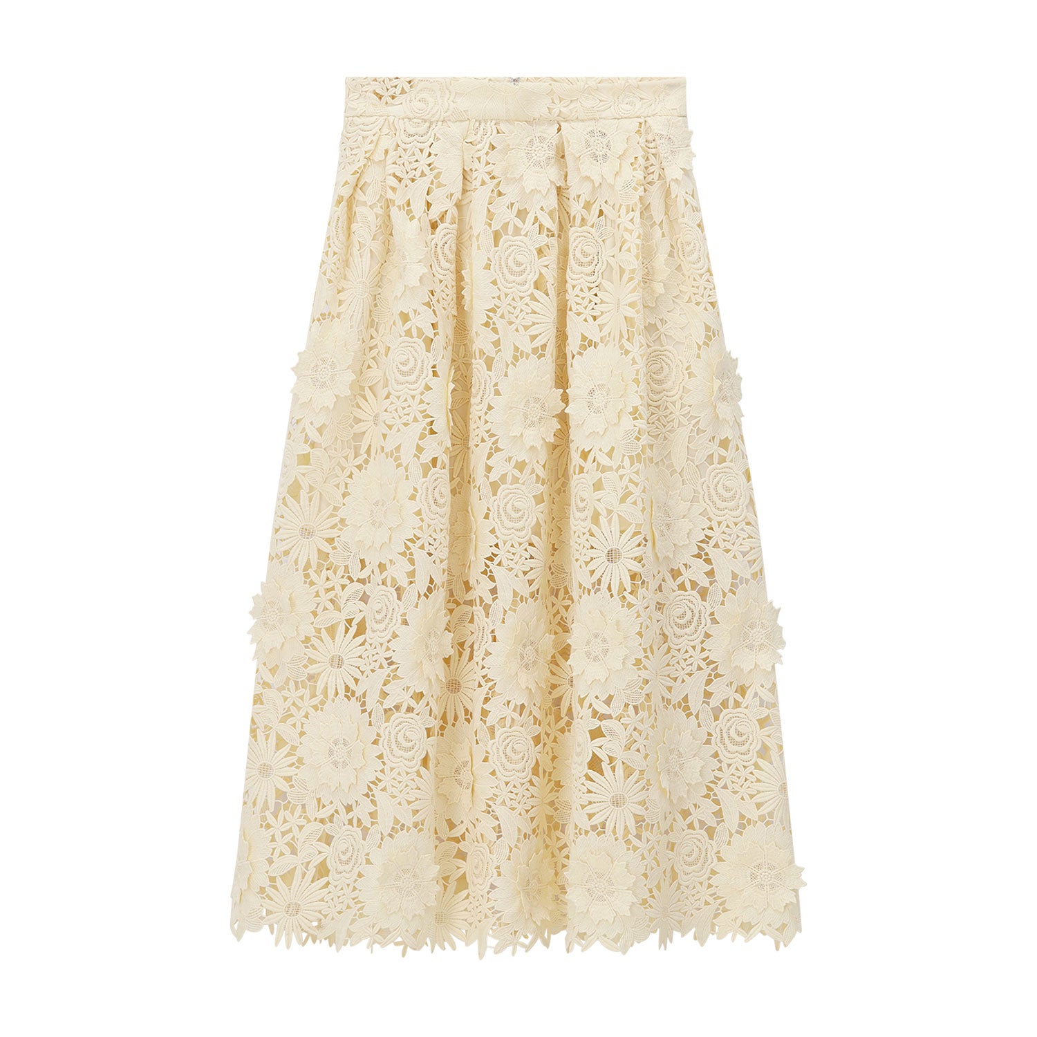 Verleihen Sie Ihrer Sommergarderobe eine dreidimensionale Dimension mit diesem spektakulären Midirock. Dieses Modell ist ein Musterbeispiel für textile Handwerkskunst. Die exklusive 3D-Spitze mit ihren haptischen, floralen Applikationen erzeugt eine lebendige, reich strukturierte Oberfläche, die bei jedem Lichtspiel neue Facetten zeigt. Der Rock besticht durch eine hohe Taille, die die Silhouette elegant betont, und geht in einen sanft ausgestellten Schnitt über. Ein besonderes Highlight ist der semi-transparente Abschluss mit einem dezenten Bogensaum, der dem Design eine zarte, feminine Leichtigkeit verleiht.