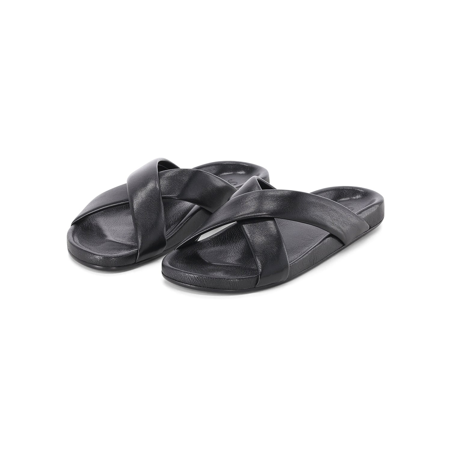 Diese Sandalen sind die Essenz von entspanntem Luxus. Das Design besticht durch seine radikale Schlichtheit: Breite, überkreuzte Riemen aus butterweichem Lammleder sorgen nicht nur für einen modernen Look, sondern auch für einen außergewöhnlich hohen Tragekomfort ohne Druckstellen. Die runde Zehenpartie und die flache Silhouette verleihen dem Schuh eine zeitlose Ästhetik, die sowohl am Strand als auch in der City überzeugt. Gefertigt in Italien, stehen diese Sandalen für erstklassige Materialqualität und eine handwerklich perfekte Verarbeitung.