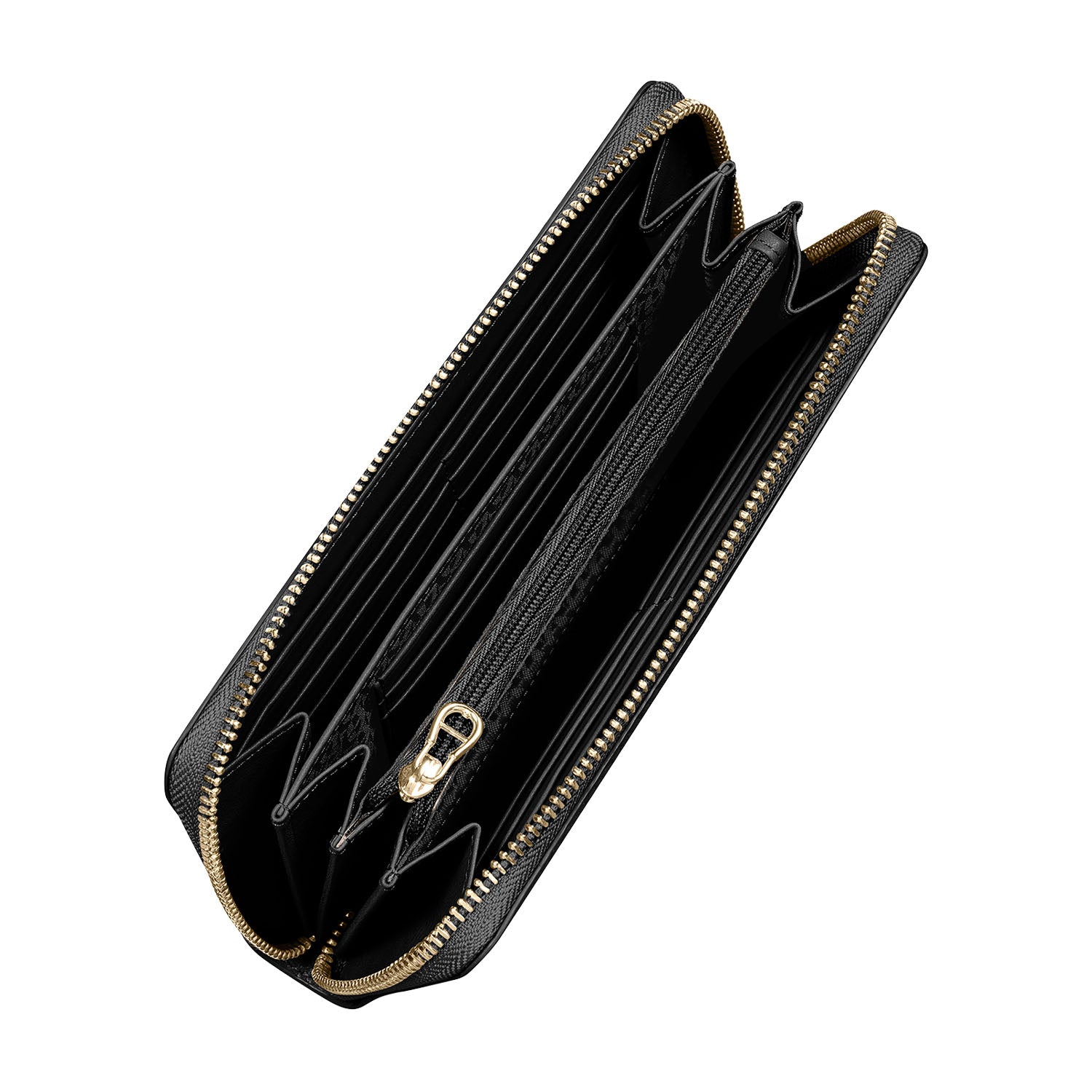 Dieses Portemonnaie aus edlem, genarbtem Rindsleder vereint Glamour und höchste Funktionalität. Der sichere Reißverschluss schützt Ihre Wertsachen, während die hellgold glänzenden Metallteile einen luxuriösen Akzent setzen. Innen ist es ein echtes Raumwunder: Mit zwölf Kreditkartenfächern, einem Münzfach sowie zwei Geldscheinfächern und drei diversen Fächern haben Sie Platz für alles Wichtige.