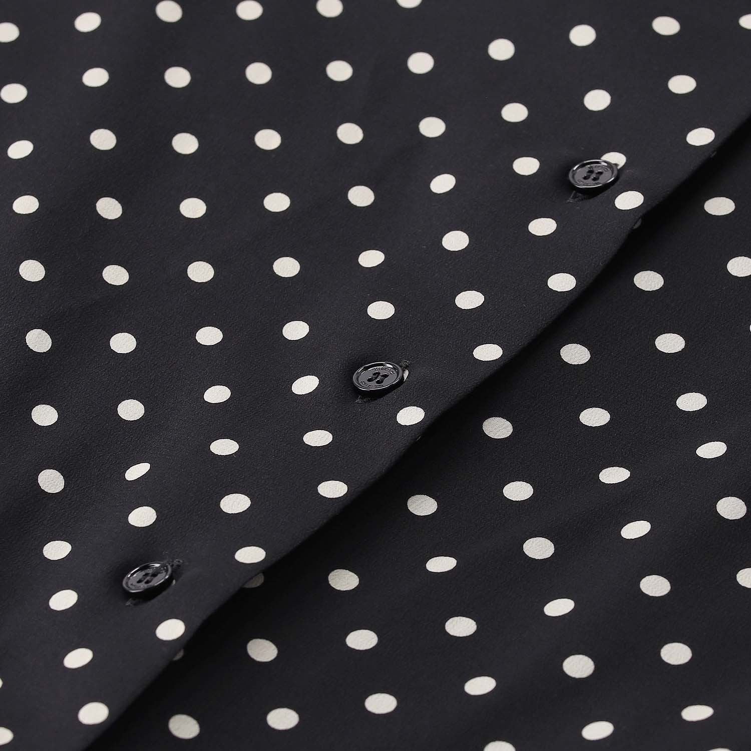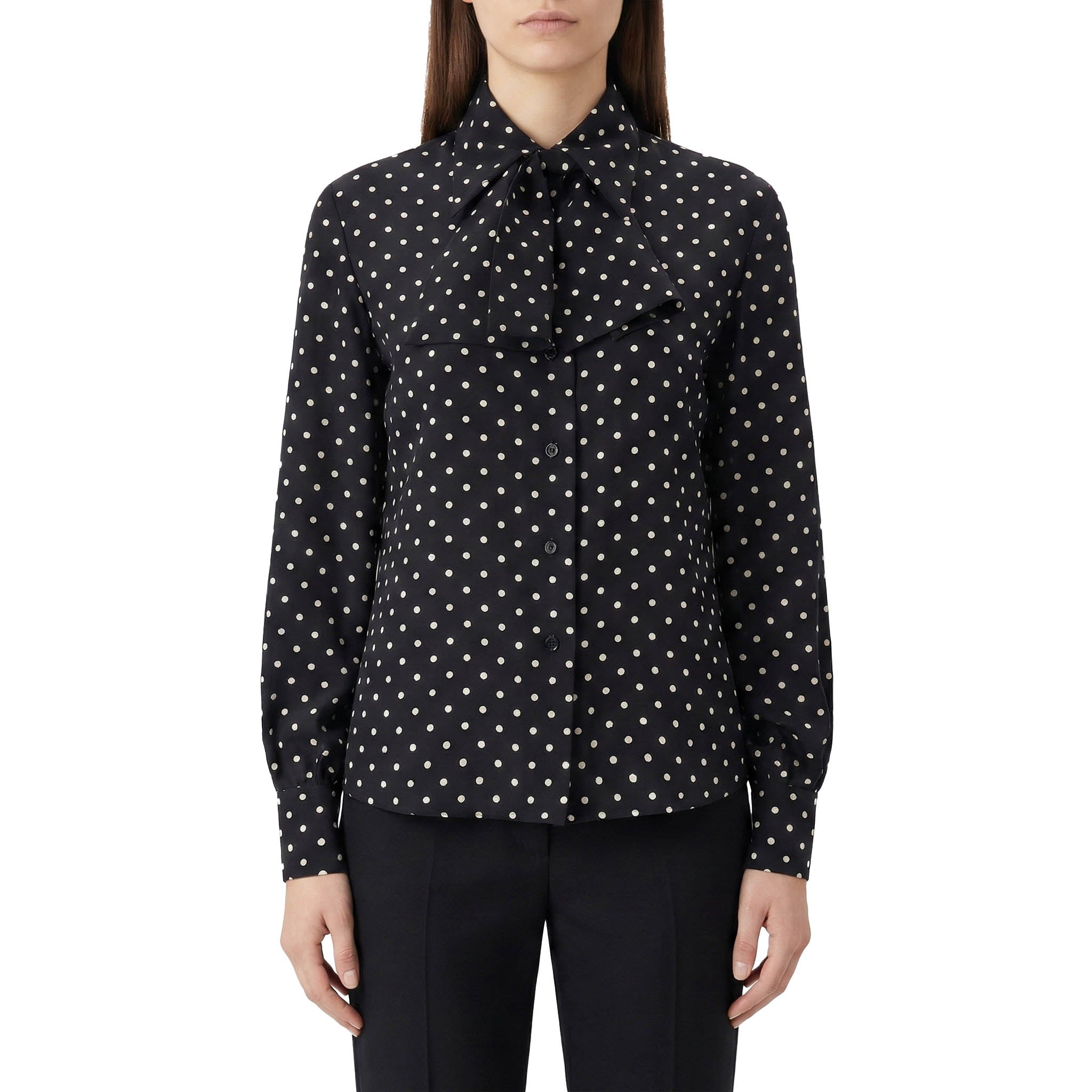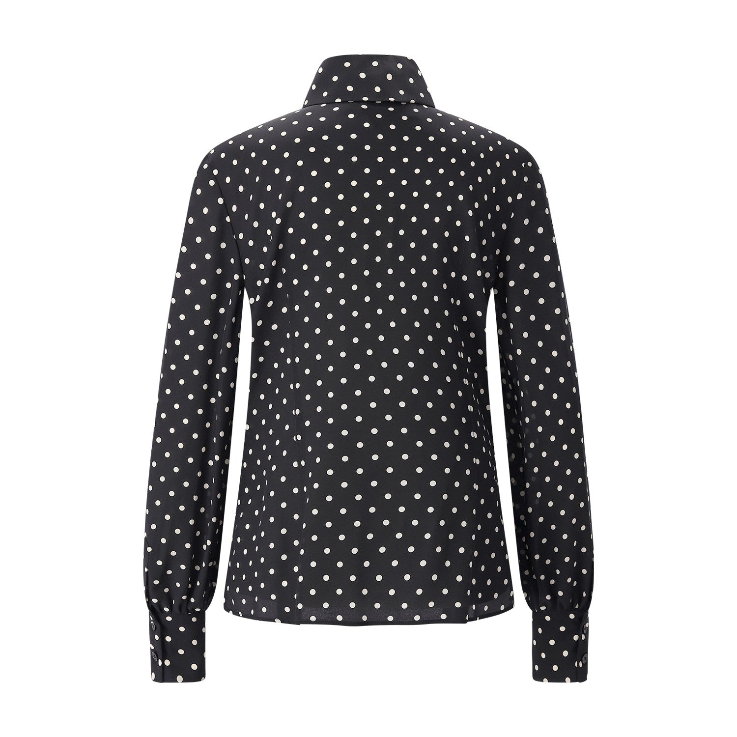 Erleben Sie italienische Eleganz pur mit dieser luxuriösen Seidenbluse, Made in Italy. Das zarte, gepunktete Muster verleiht ihr eine zeitlose, romantische Note. Die stilvolle Schluppe kann nach Belieben gebunden werden, während die durchgehende Knopfleiste das klassische Design abrundet. Diese Bluse aus fließender Seide ist ein exquisites Kleidungsstück, das Sie sowohl im Büro als auch bei festlichen Anlässen zum Strahlen bringt.