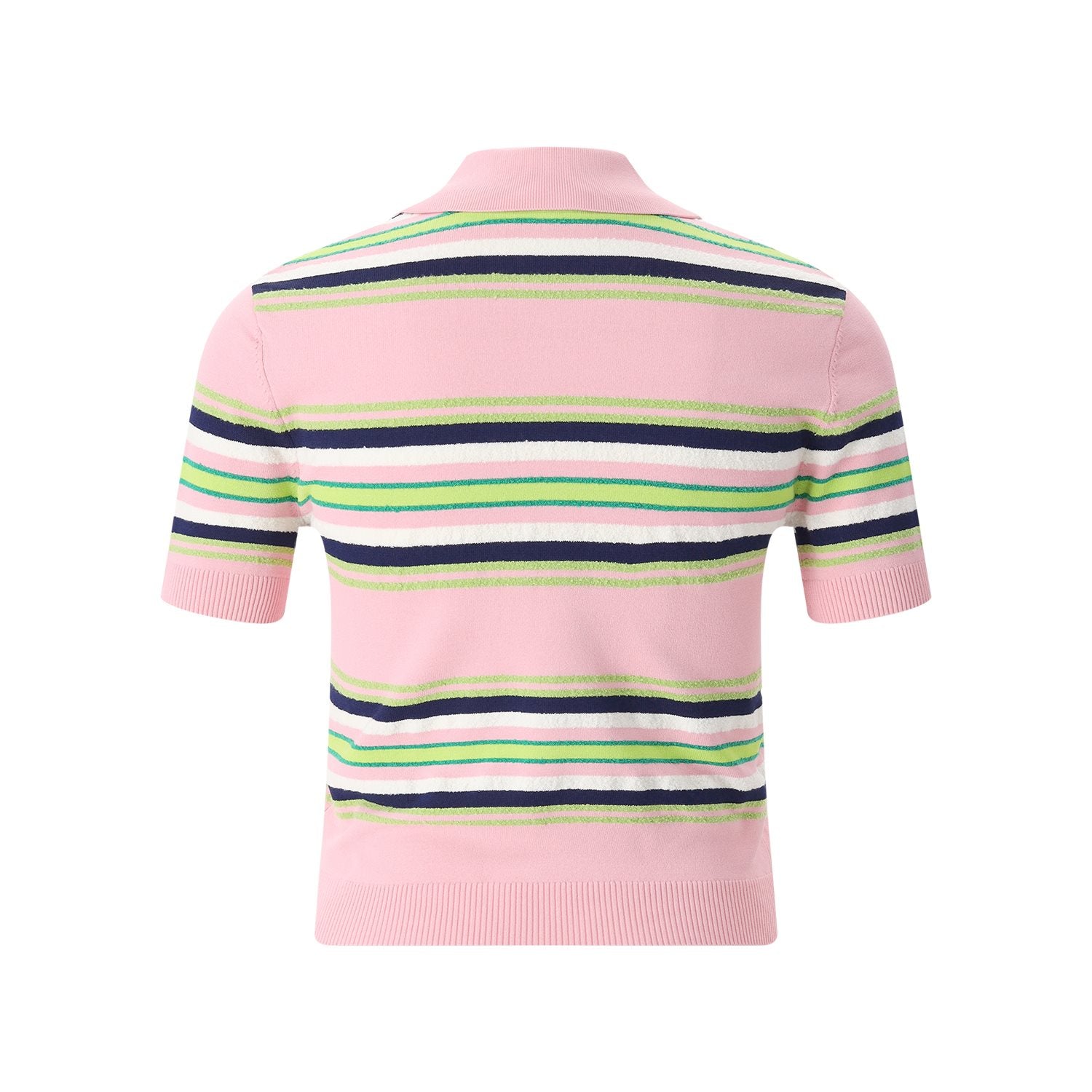 Dieses Polo-Shirt besticht durch sein hochwertiges, gestreiftes Strickdesign. Die Kombination verleiht dem Piece eine frische, moderne Optik, während das charakteristische Diamant-Logo der Marke für einen exklusiven Wiedererkennungswert sorgt. Besondere Highlights sind die edlen Perlmuttknöpfe mit Goldrand, die der Knopfleiste ein luxuriöses Finish verleihen. Mit seiner schmalen Silhouette und den präzisen Rippstrick-Details an Kragen, Ärmeln und Saum ist dieses Shirt ein Statement für gehobenen Stil.