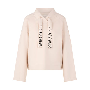 Dieses Sweatshirt überzeugt mit einem lässigen und entspannten Schnitt, der für den perfekten Tragekomfort sorgt. Dank der entspannten Form mit weit geschnittenen Ärmeln und leicht überschnittenen Schultern bietet es eine moderne Silhouette und ein wunderbar weiches Tragegefühl. Das Highlight ist der Tunnelzug am Kragen: Das integrierte Band ist mit edlen Perlen-Applikationen veredelt, die dem sportiven Sweatstoff einen eleganten, femininen Touch verleihen.