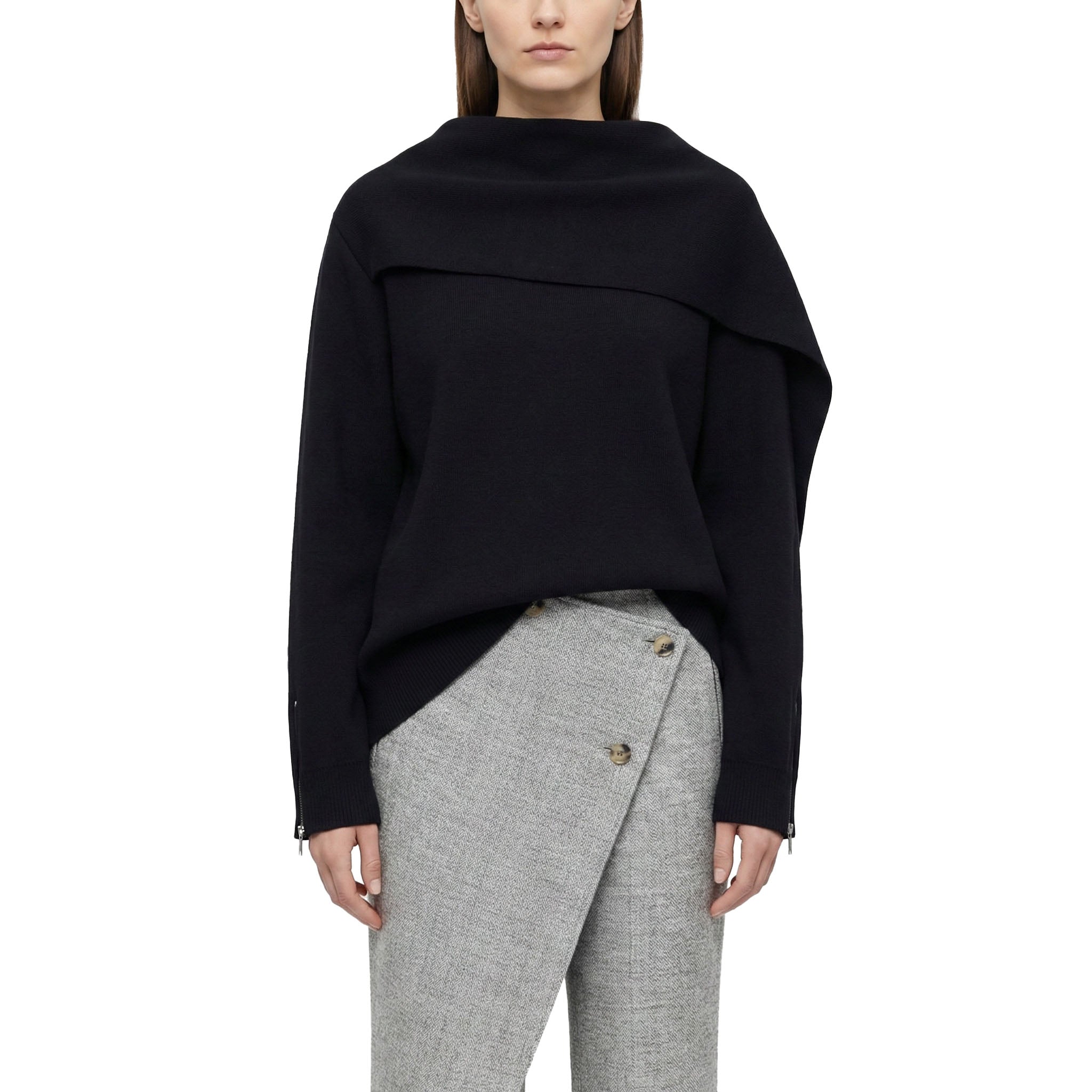 This luxurious oversized sweater, crafted from 100% merino wool, combines exceptional design with ultimate comfort. The integrated, buttoned scarf detail adds a sophisticated touch, while the zippered cuffs provide a modern accent. The soft wool knit offers pleasant warmth and boasts high-quality craftsmanship, made in Portugal.
