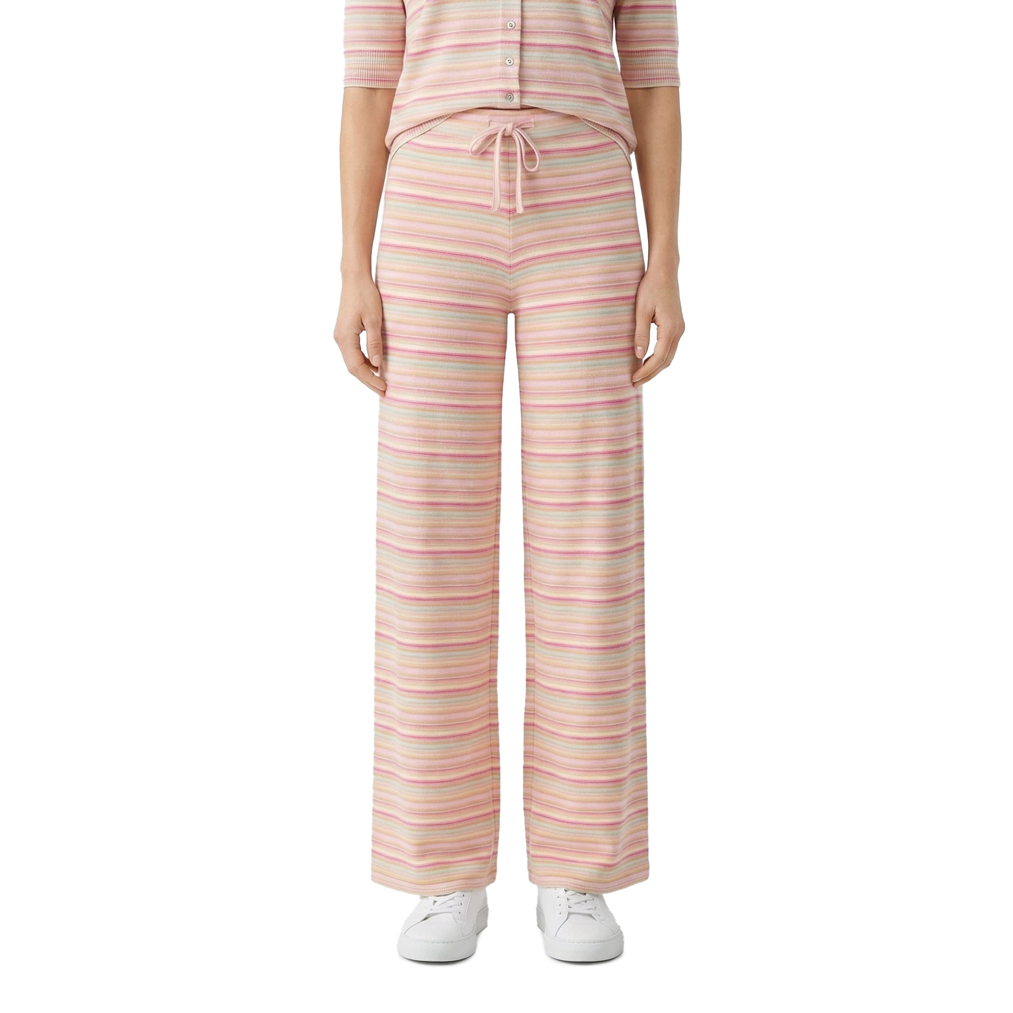 Diese weit geschnittene Hose kombiniert entspannten Komfort mit einem Design. Gefertigt aus reiner Merinowolle, bietet sie ein besonders weiches Tragegefühl und eine natürliche Temperaturregulierung. Das mehrfarbige Streifenmuster verleiht der Hose eine moderne, dynamische Optik, während die weite Beinführung für eine fließende Silhouette sorgt. Ein elastischer Bund mit verstellbarem Kordelzug garantiert zudem eine individuelle Passform und höchsten Tragekomfort im Alltag.
