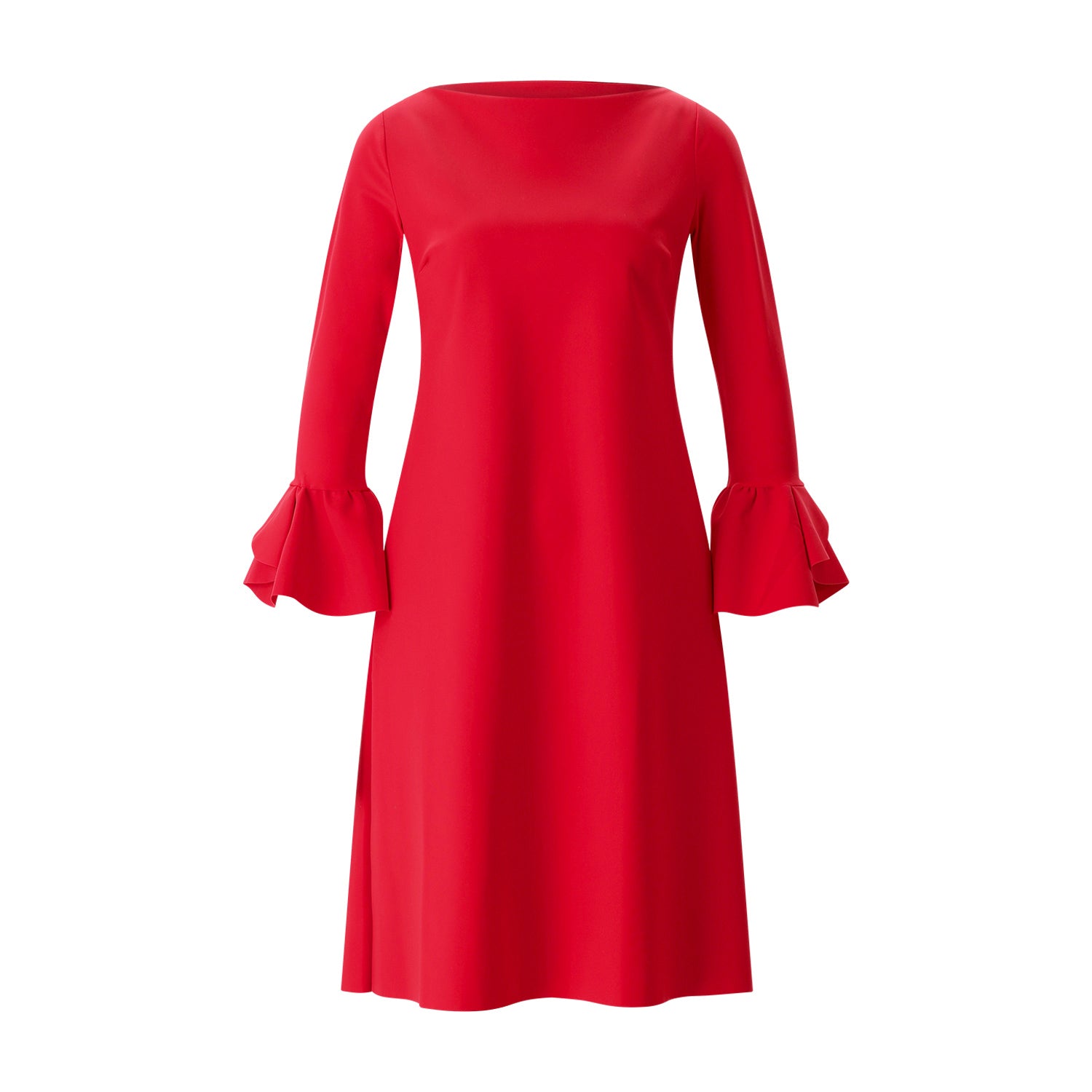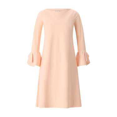 Dieses in Italien gefertigte Kleid vereint meisterhaft modernen Komfort mit femininer Eleganz. Das Modell besticht durch seine klare A-Linien-Silhouette und den edlen U-Boot-Ausschnitt, während die markanten Volant-Ärmel für eine verspielte und dennoch souveräne Dynamik sorgen. Gefertigt aus dem labeltypischen, knitterfreien Mix-Jersey, schmiegt es sich perfekt an die Figur an und bleibt dabei den ganzen Tag über absolut bequem.
