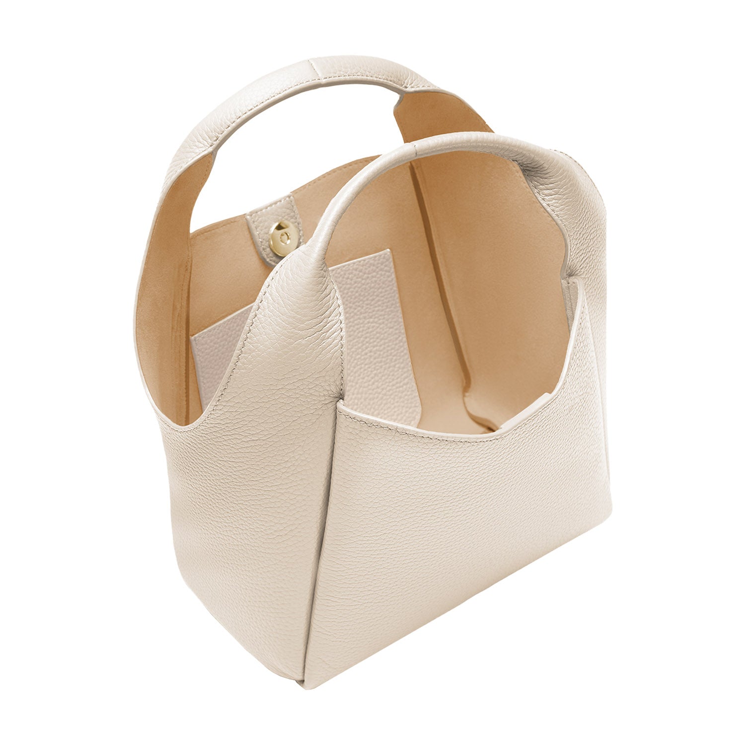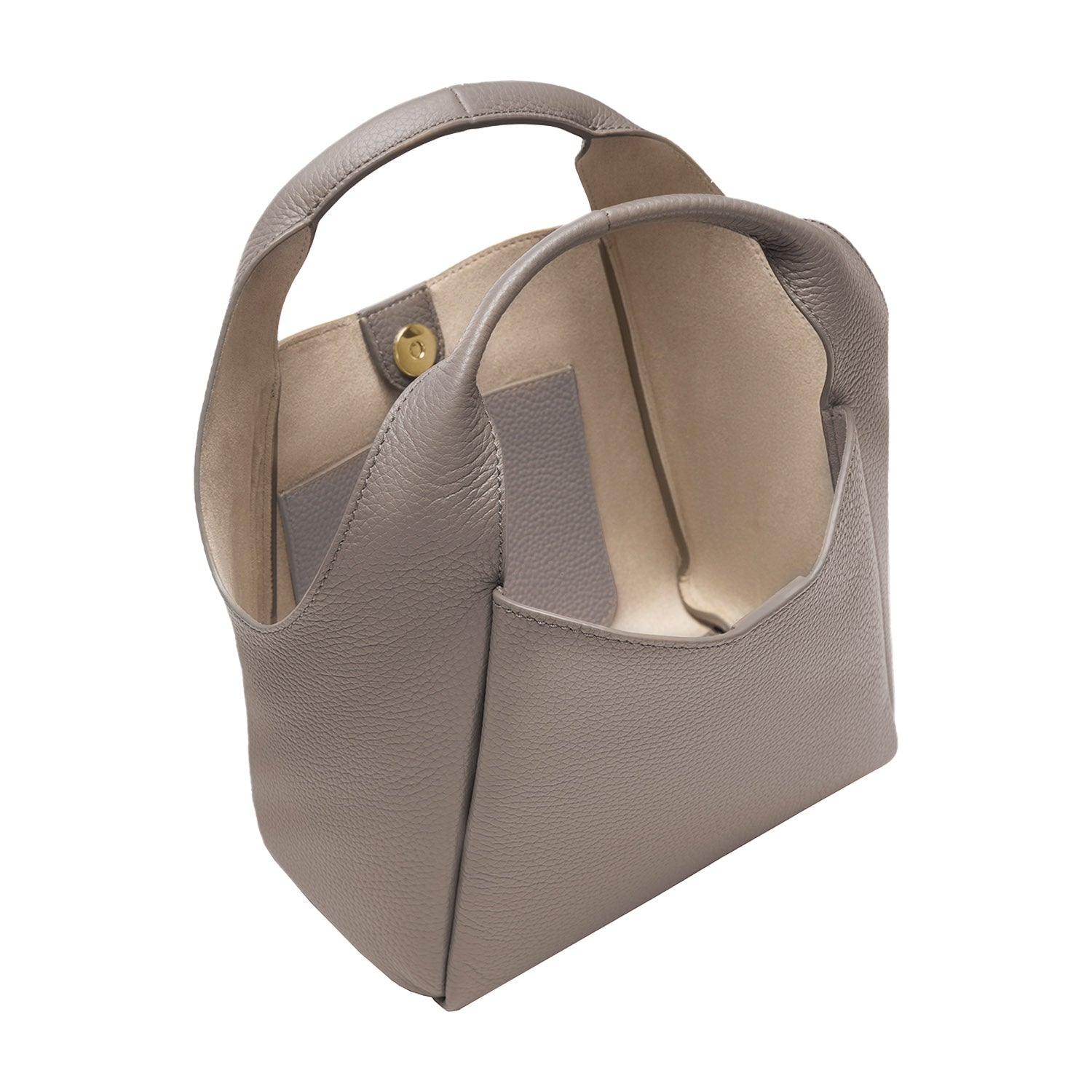 Aus italienischer Fertigung stammend, kombiniert diese Handtasche aus genarbtem Rindsleder eine markante Textur mit einer kompakten, strukturierten Form. Das Hauptfach schließt sicher per Magnetverschluss und bietet mit einem zusätzlichen internen Steckfach eine praktische Aufteilung für Ihre Essentials. Glänzende Metallteile setzen edle Akzente, während die Griffhöhe ein elegantes Tragen in der Hand ermöglicht.