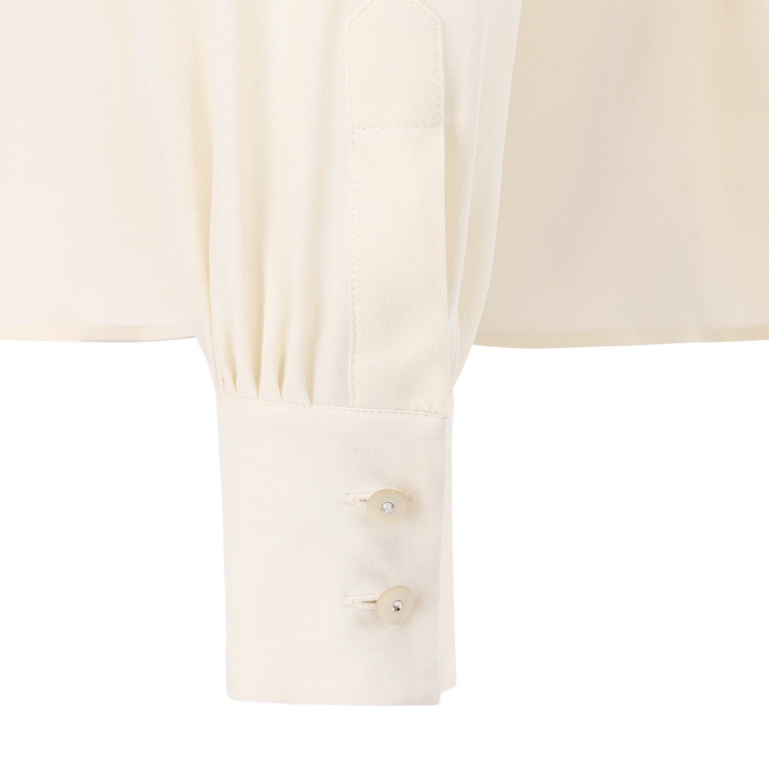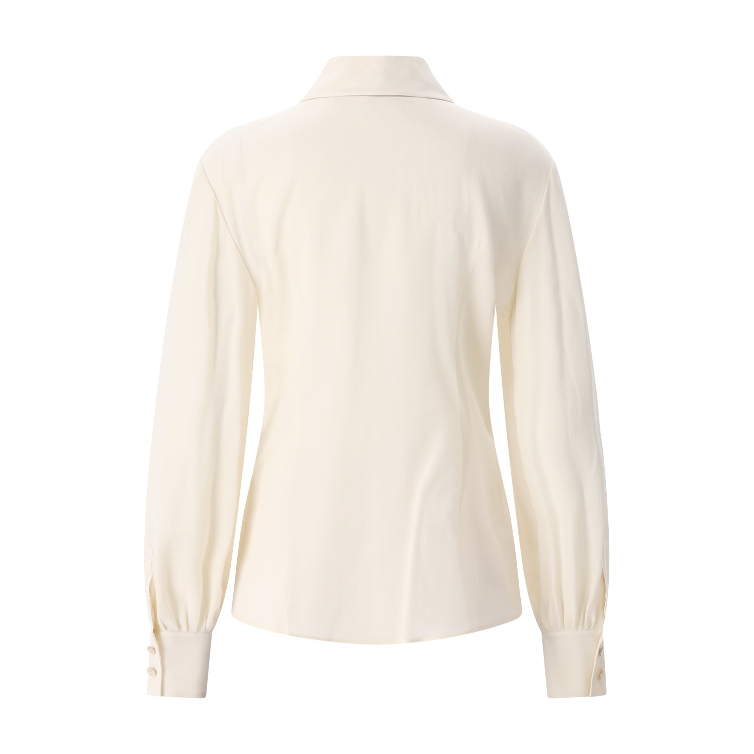 Diese elegante Bluse aus feiner Crêpe de Chine-Seide vereint luxuriösen Komfort mit femininer Raffinesse. Der V-Ausschnitt und das integrierte Halstuch-Detail setzen stilvolle Akzente, während der Knopfverschluss vorne klassische Eleganz ausstrahlt. Hergestellt in Italien.
