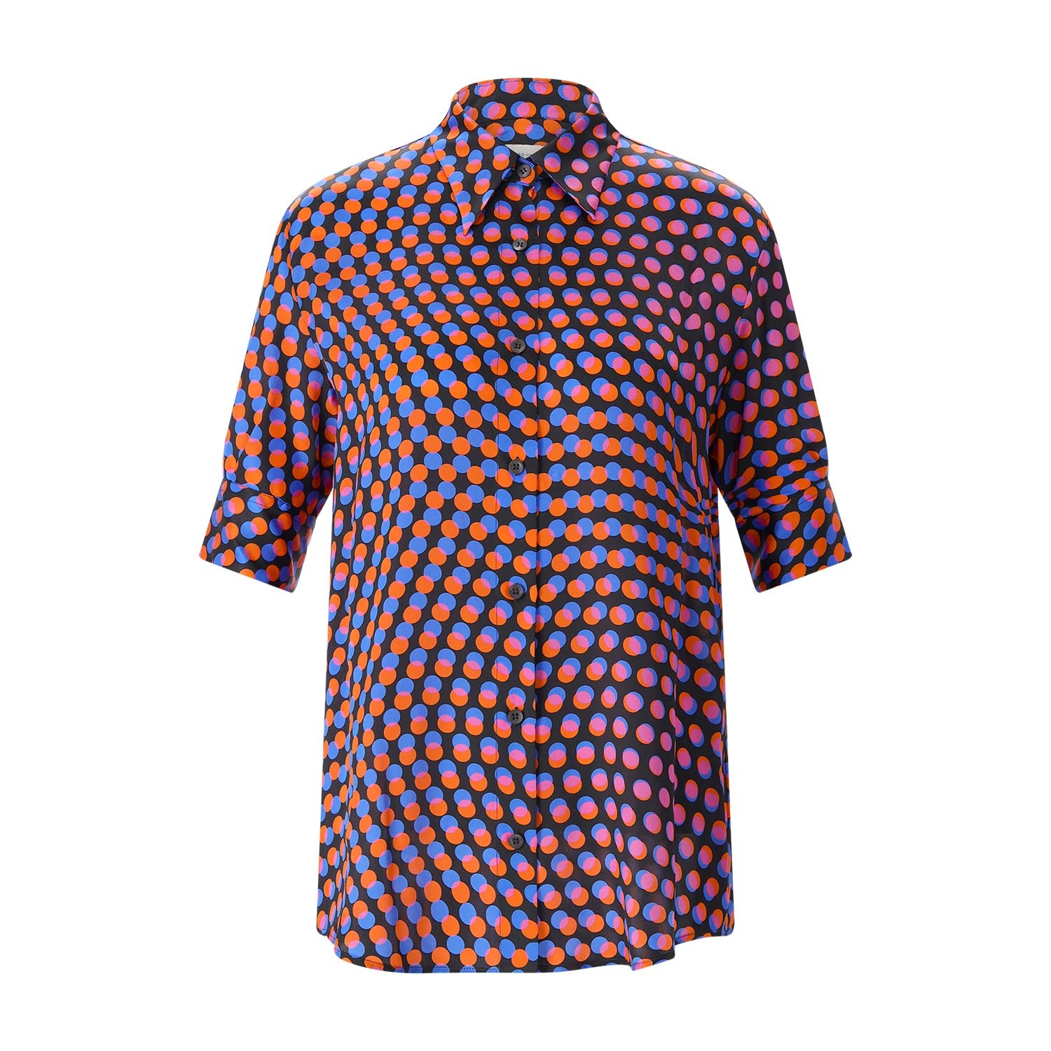 Gefertigt aus reiner, luxuriöser Seide, besticht die Hemdbluse durch einen fließenden Fall und einen dezenten Glanz, der das zeitlose Punktemuster besonders edel zur Geltung bringt. Die kurzen Ärmel und der präzise geschnittene Hemdkragen verleihen der Bluse eine strukturierte Optik, während die durchgehende Knopfleiste für ein klassisches Finish sorgt.