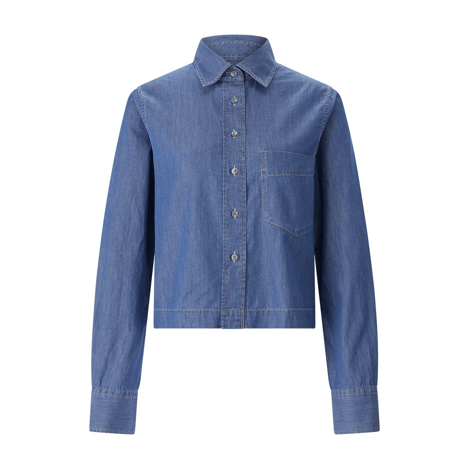 Diese Hemdbluse aus hochwertiger Baumwolle begeistert durch ihre authentische Denim-Optik und den trendigen Cropped-Schnitt. Ausgestattet mit klassischem Kragen, durchgehender Knopfleiste und einer praktischen Brusttasche, ist sie das ideale Highlight für Ihre Daily-Looks.