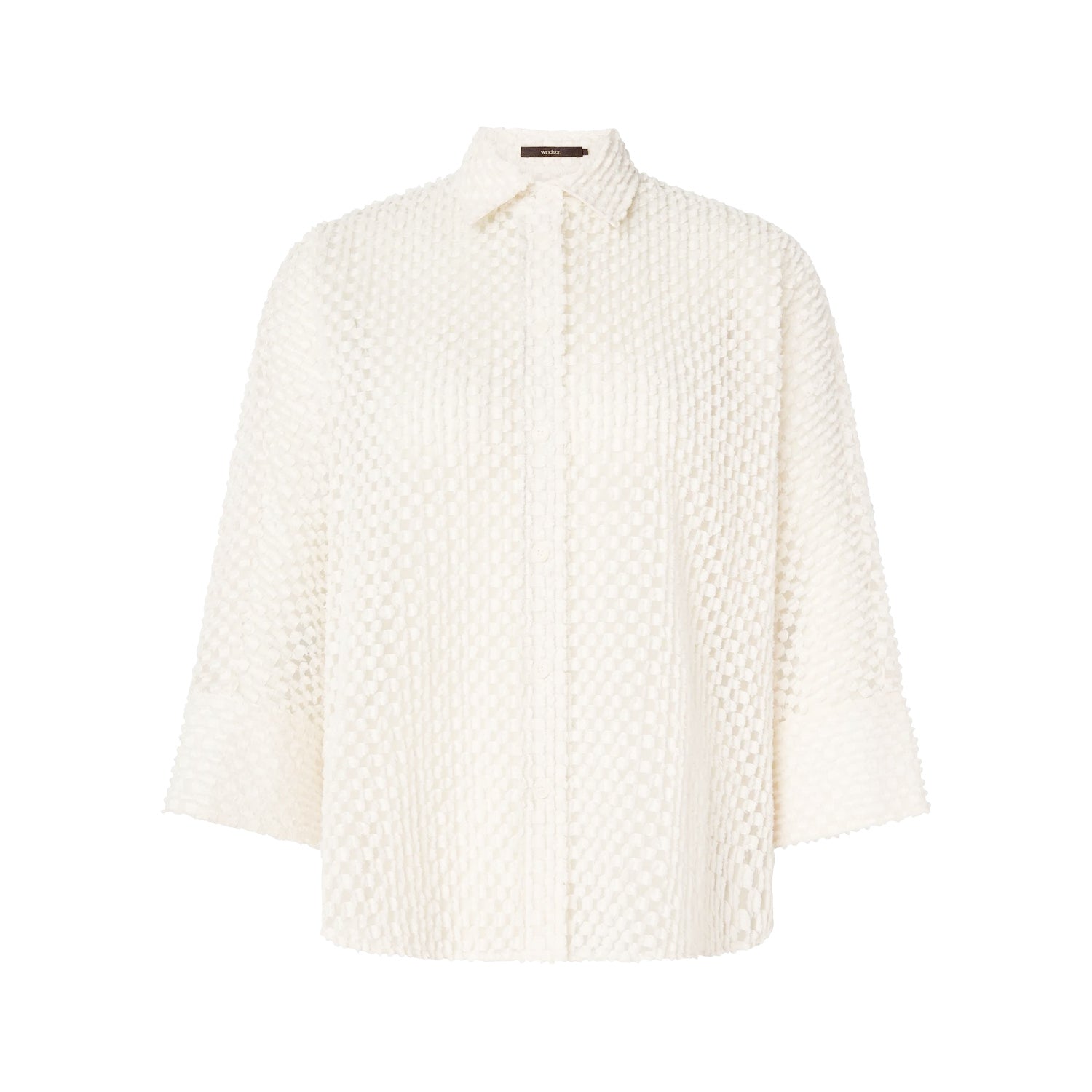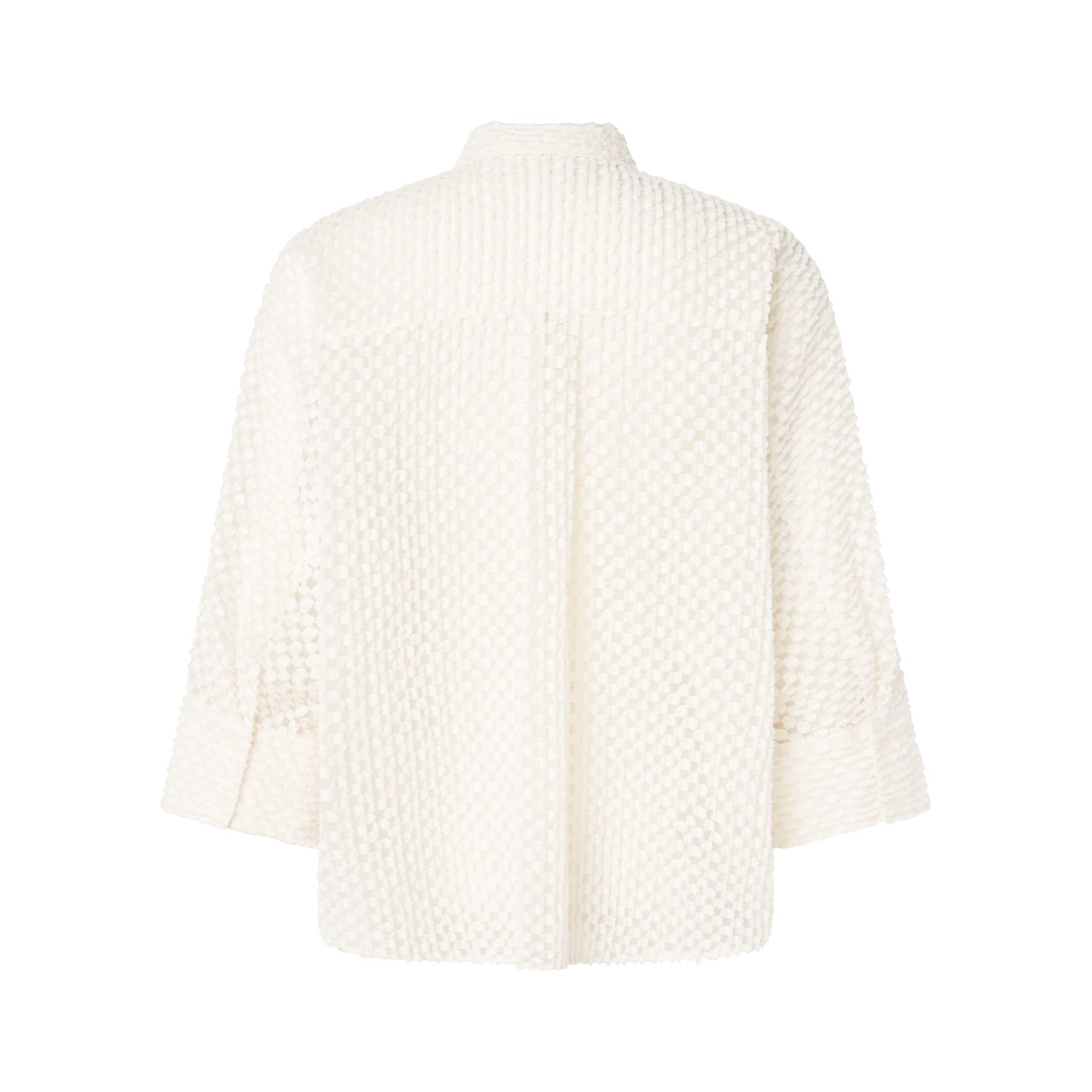 Diese Bluse im Loose Fit besticht durch ihre besondere Struktur, die dem klassischen Design eine moderne Tiefe verleiht. Die Kombination aus überschnittenen Schultern und weiten Dreiviertelärmeln sorgt für eine entspannte Silhouette und ein luftiges Tragegefühl. Mit ihrem zeitlosen Hemdblusenkragen und der durchgehenden Knopfleiste lässt sich die Bluse vielseitig stylen – ob elegant geschlossen oder lässig offen getragen. Ein hochwertig verarbeitetes Essential, das durch seine außergewöhnliche Haptik und den klaren Look überzeugt.
