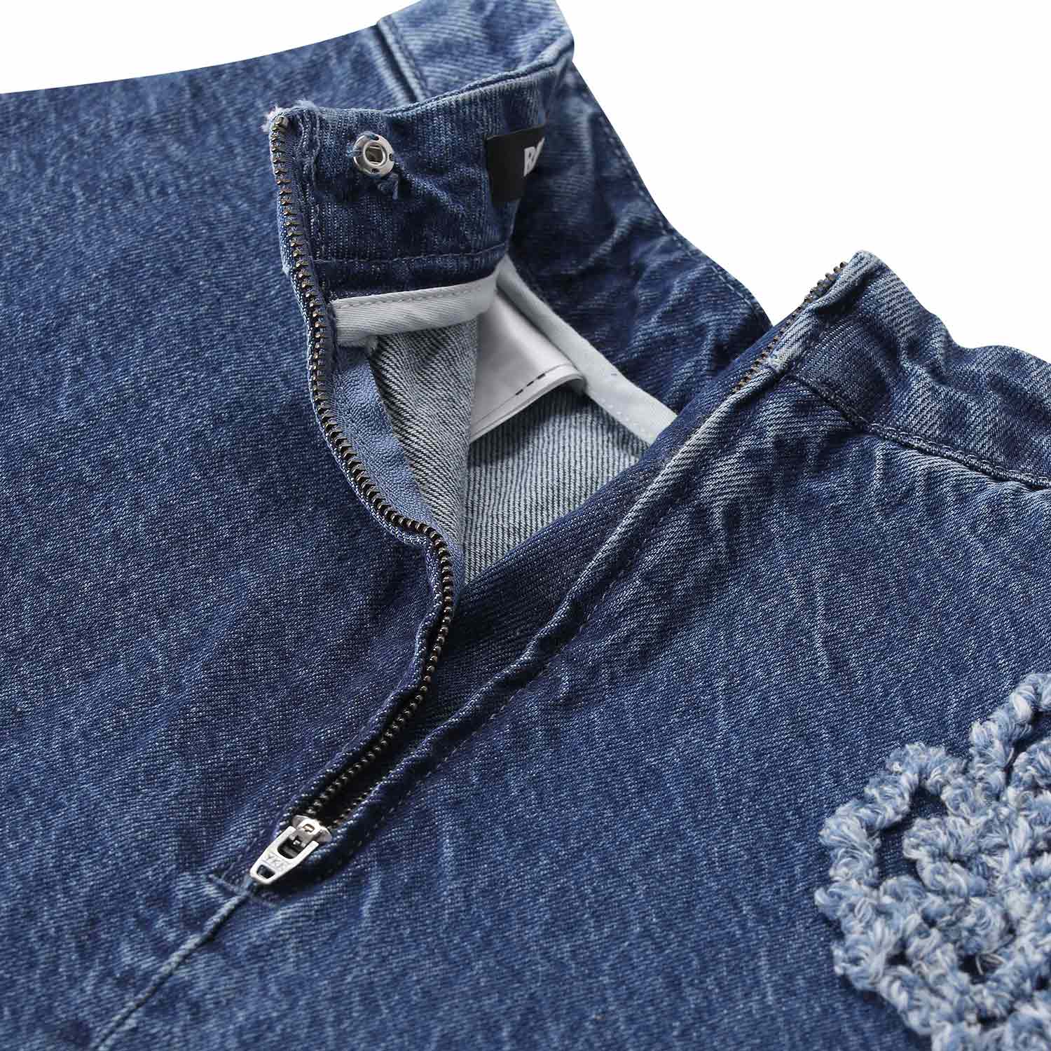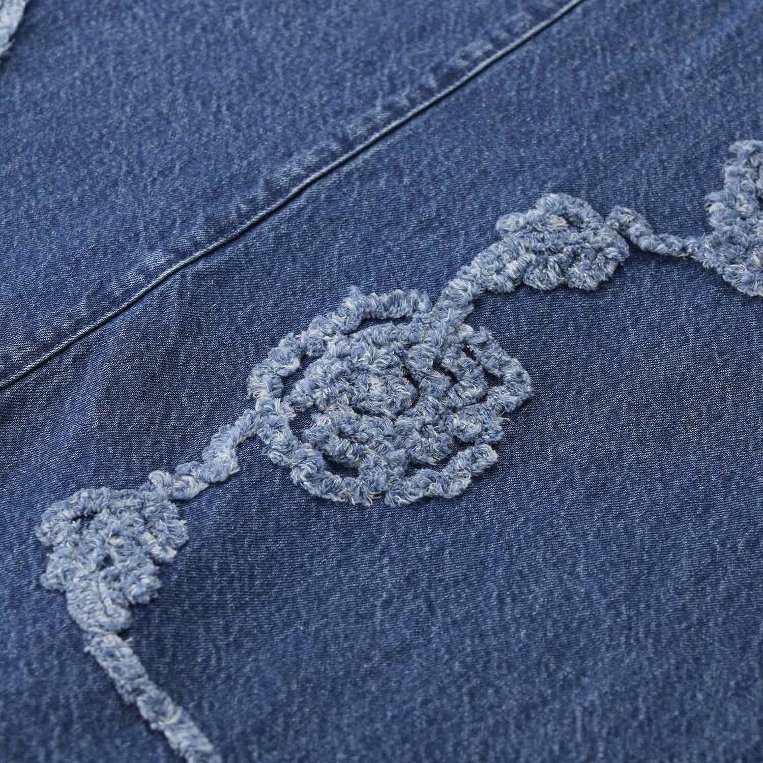 Dieser Midirock aus Denim besticht durch seine weite A-Linie, die für eine fließende, feminine Silhouette sorgt. Ein besonderer Blickfang sind die gefransten Blumen, die dem robusten Stoff eine kunstvolle Struktur verleihen. Ausgestattet mit einem dezenten rückseitigen Reißverschluss und zwei praktischen Seitentaschen, vereint dieses Modell modisches Statement mit täglichem Komfort.
