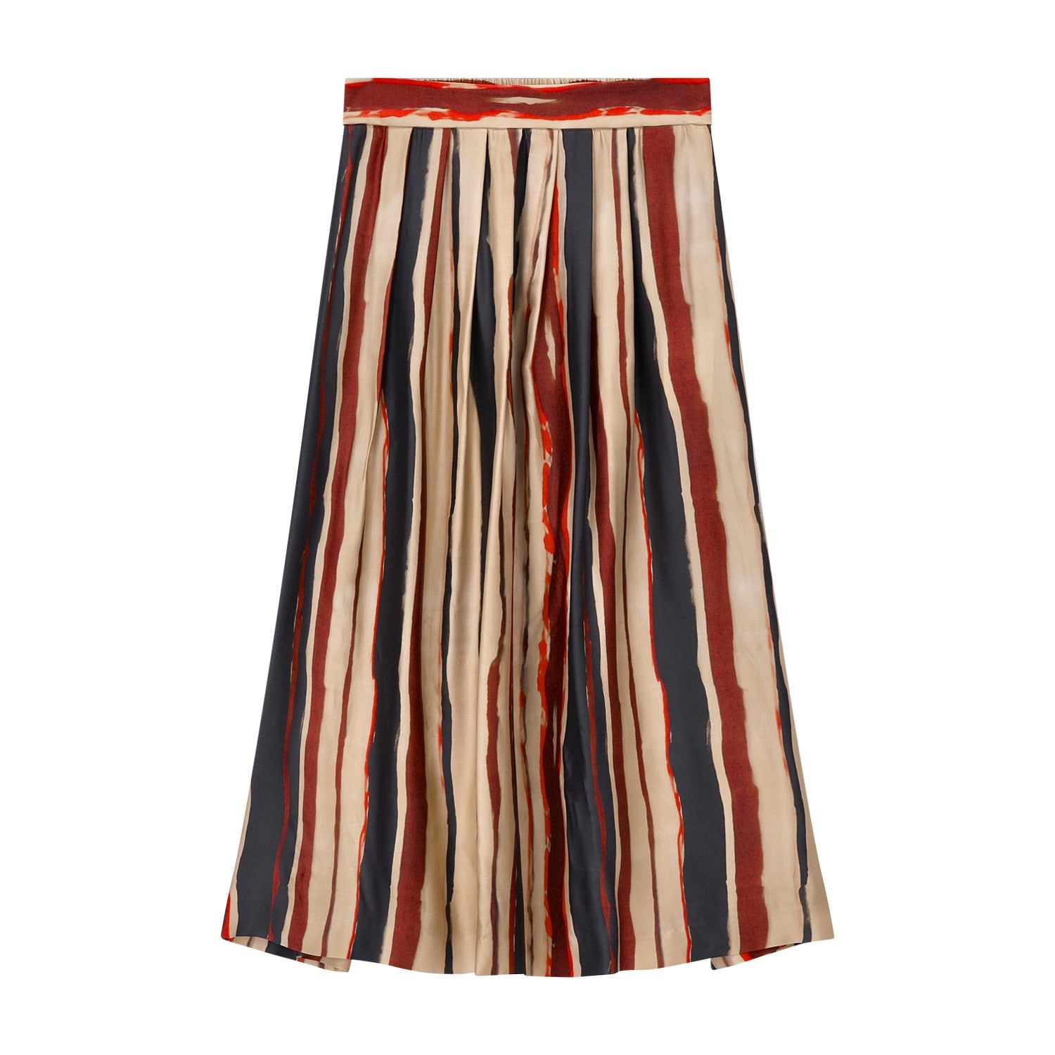 Dieser elegante Midirock vereint Glanz mit gemustertem Design. Das gestreifte Design streckt optisch die Silhouette, während die weite Passform und das fließende Satin-Material für eine edle Bewegung sorgen. Gefertigt in Italien, bietet das Modell durch den teilelastischen Bund eine perfekte Verbindung aus erstklassigem Sitz und angenehmem Komfort.