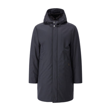 Dieser glatte Mantel aus der exklusiven Acqua-Linie vereint Hightech mit italienischer Eleganz. Wattiert mit luxuriösen Gänsedaunen, bietet er angenehme Wärme, während die feine technische Gabardine mit atmungsaktiver, wasserdichter Membran zuverlässig vor Wind und Wetter schützt. Der Frontverschluss mit Doppelschieber-Reißverschluss und verdeckten Knöpfen sorgt für eine cleane Silhouette.