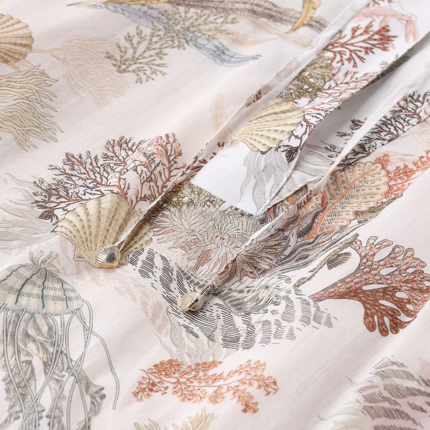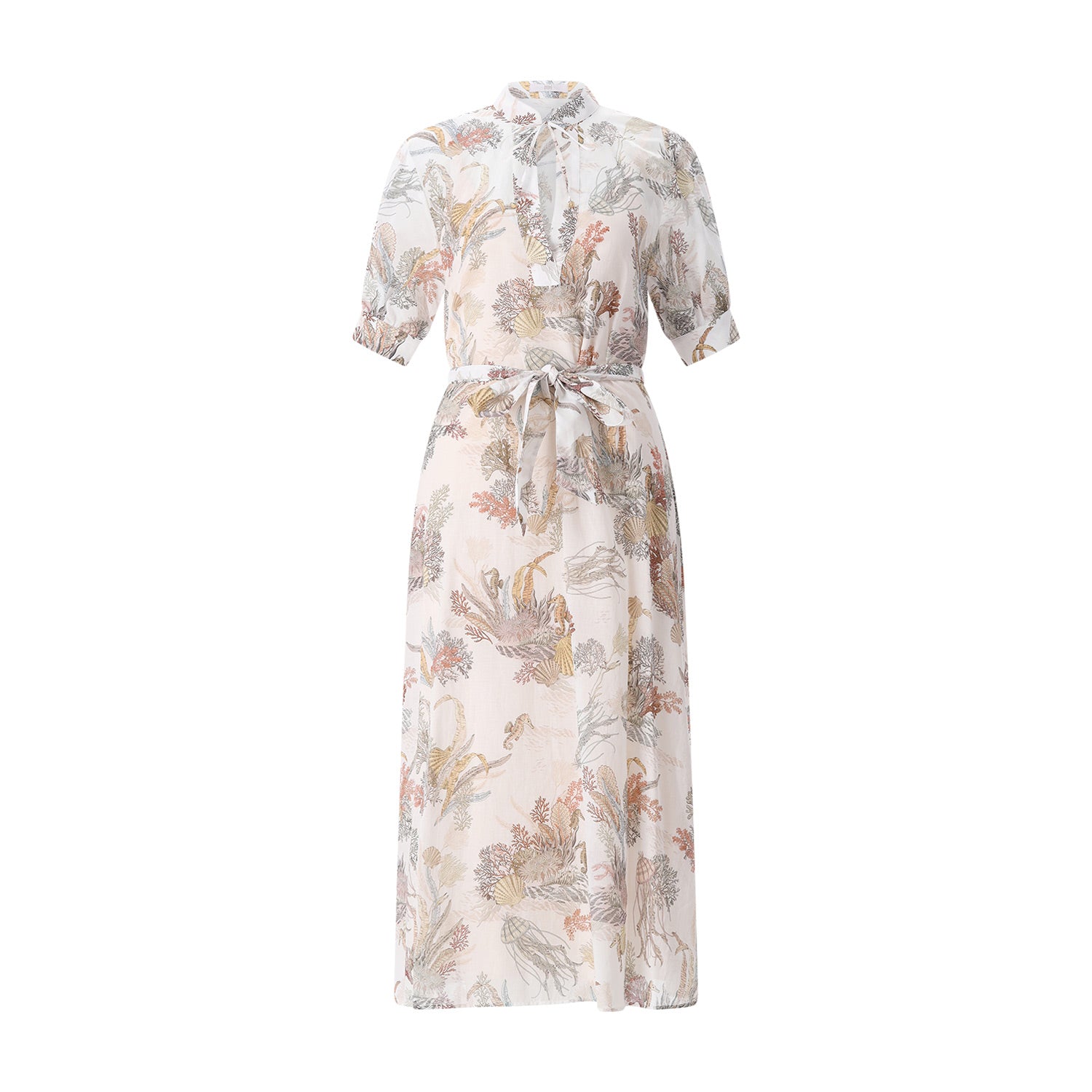 Dieses Kleid ist eine Hommage an den Sommer und besticht durch seinen einzigartigen, detaillierten Muschelprint. Das Design strahlt eine entspannte Eleganz aus und ist die ideale Wahl für sonnige Tage am Meer oder stilvolle Gartenfeste. Gefertigt aus einem leichten, angenehm zu tragenden Material, umspielt es sanft die Silhouette, während der Bindegürtel in der Taille individuelle Akzente setzt und die feminine Form betont.