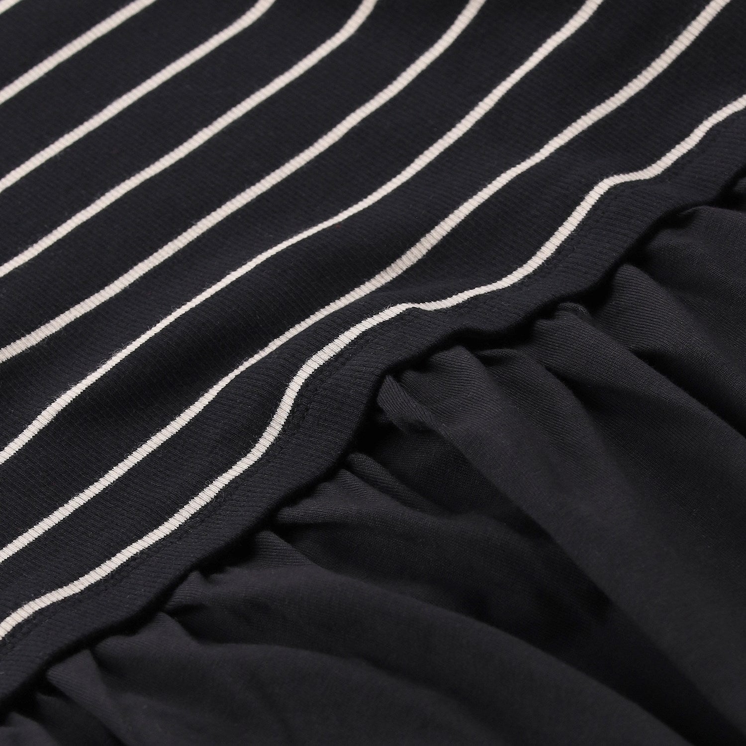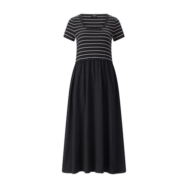 Das Oberteil ist im Stil eines klassischen Ringelshirts gehalten und besteht aus einer fein strukturierten Ringelrippe. Es verfügt über einen zeitlosen Rundhalsausschnitt sowie kurze Ärmel und liegt angenehm körpernah an. Im Kontrast dazu steht das Unterteil, das in einer locker-luftigen Midi-Länge fließt. Der weit ausgestellte Rock verleiht dem Kleid eine raffinierte Dynamik und sorgt für eine feminine Silhouette.